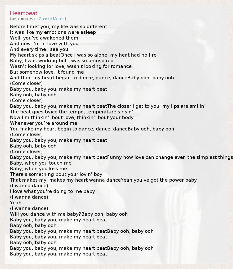 Before I met you, my life was so different It was like my emotions were asleep Well, you've awakened them And now I'm in love with you And every time I see you My heart skips a beatOnce I was so alone, my heat had no fire Baby, I was working but I was so uninspired Wasn't looking for love, wasn't looking for romance But somehow love, it found me And then my heart began to dance, dance, danceBaby ooh, baby ooh (Come closer) Baby you, baby you, make my heart beat Baby ooh, baby ooh (Come closer) Baby you, baby you, make my heart beatThe closer I get to you, my lips are smilin' The beat goes twice the tempo, temperature's risin' Now I'm thinkin' 'bout love, thinkin' 'bout your body Whenever you're around me You make my heart begin to dance, dance, danceBaby ooh, baby ooh (Come closer) Baby you, baby you, make my heart beat Baby ooh, baby ooh (Come closer) Baby you, baby you, make my heart beatFunny how love can change even the simplest things Baby, when you touch me Baby, when you kiss me There's something bout your lovin' boy That makes my, makes my heart wanna danceYeah you've got the power baby (I wanna dance) I love what you're doing to me baby (I wanna dance) Yeah (I wanna dance) Will you dance with me baby?Baby ooh, baby ooh Baby you, baby you, make my heart beat Baby ooh, baby ooh Baby you, baby you, make my heart beatBaby ooh, baby ooh Baby you, baby you, make my heart beat Baby ooh, baby ooh Baby you, baby you, make my heart beatBaby ooh, baby ooh Baby you, baby you, make my heart beat
