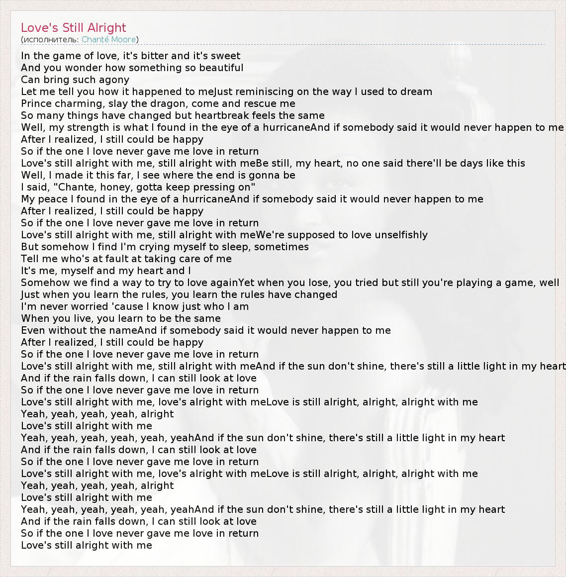 Love's still alright with me, love's alright with meLove is still alright, alright, alright with me
