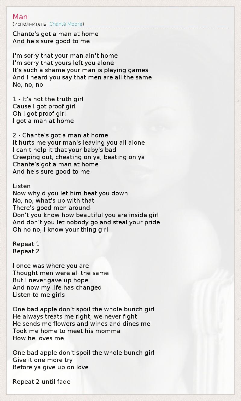 Это интересно:Чанте Торран Мур (Chanté Torrane Moore) - американская R&B и джазовая исполнительница. Родилась 17 февраля 1967 года в Сан-Франциско (Калифорния) в семье священника-евангелиста. В период взросления пела в церкви и находилась под сильным влиянием музыки Джорджа Дюка и Ли Райтнура. В старших классах школы твёрдо решила стать певицей. Успешно показывала себя на конкурсах красоты, и некоторое время была... продолжение