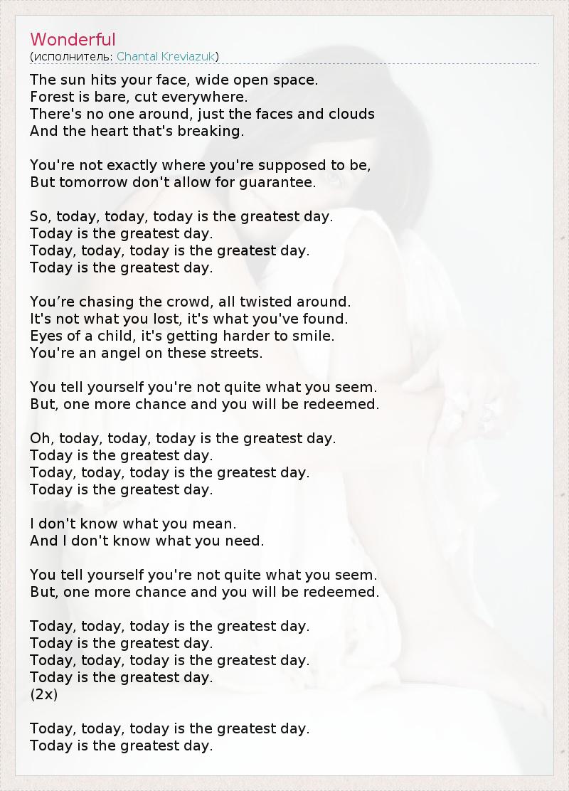 Солнце бьёт тебе прямо в лицо, во всю ширь Голый лес, вырубленный повсюду. И никого вокруг, только сплошной горизонт и облака, И сердце, которое бьется на куски. Ты не совсем там, где тебе положено быть, Но завтрашний день не подразумевает гарантии. Так что, сегодня, сегодня, сегодня самый прекрасный день. Сегодня самый прекрасный день. Сегодня, сегодня, сегодня самый прекрасный день. Сегодня самый прекрасный день. Ты гонишься за толпой, совершенно запутавшись. Важно не то, что ты потерял, важно то, что ты нашёл. Глаза ребенка, становится всё труднее улыбаться. Ты ангел на этих улицах. Ты говоришь себе, что ты не совсем тот, кем кажешься. Но еще один шанс и ты будешь искуплен. О, сегодня, сегодня, сегодня самый прекрасный день. Сегодня самый прекрасный день. Сегодня, сегодня, сегодня самый прекрасный день. Сегодня самый прекрасный день. Я не знаю, что ты имеешь в виду. И я не знаю, что тебе нужно. Ты говоришь себе, что ты не совсем тот, кем кажешься. Но еще один шанс и ты будешь искуплен. Сегодня, сегодня, сегодня самый прекрасный день. Сегодня самый прекрасный день. Сегодня, сегодня, сегодня самый прекрасный день. Сегодня самый прекрасный день. (2 раза) Сегодня, сегодня, сегодня самый прекрасный день. Сегодня самый прекрасный день.
