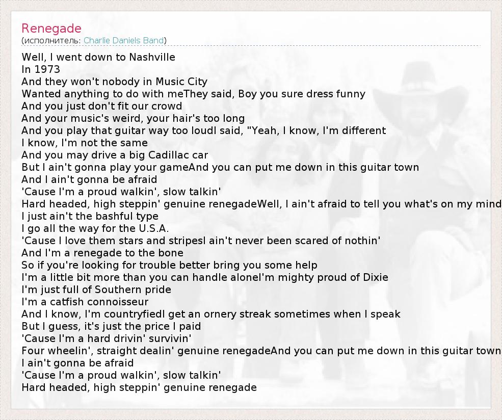 Hard headed, high steppin' genuine renegadeWell, I ain't afraid to tell you what's on my mind