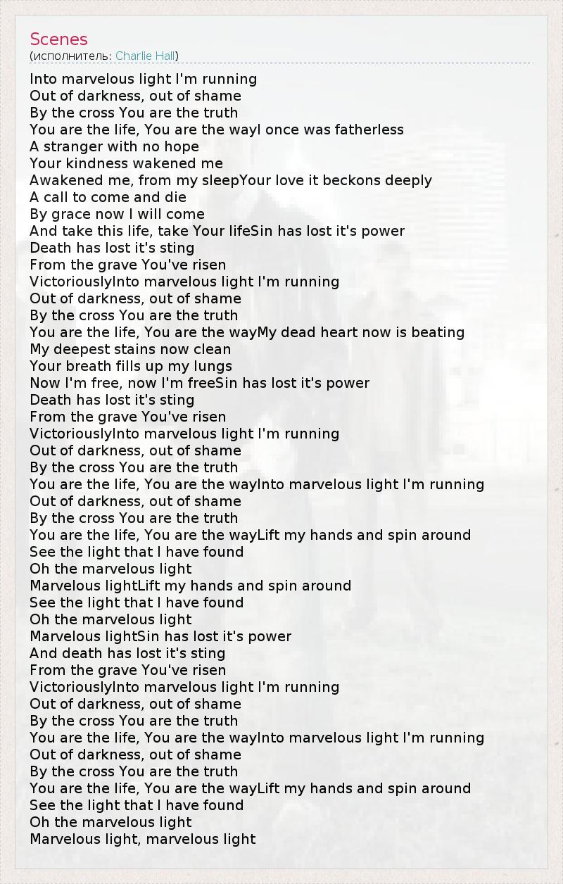 Into marvelous light I'm running Out of darkness, out of shame By the cross You are the truth You are the life, You are the wayI once was fatherless A stranger with no hope Your kindness wakened me Awakened me, from my sleepYour love it beckons deeply A call to come and die By grace now I will come And take this life, take Your lifeSin has lost it's power Death has lost it's sting From the grave You've risen VictoriouslyInto marvelous light I'm running Out of darkness, out of shame By the cross You are the truth You are the life, You are the wayMy dead heart now is beating My deepest stains now clean Your breath fills up my lungs Now I'm free, now I'm freeSin has lost it's power Death has lost it's sting From the grave You've risen VictoriouslyInto marvelous light I'm running Out of darkness, out of shame By the cross You are the truth You are the life, You are the wayInto marvelous light I'm running Out of darkness, out of shame By the cross You are the truth You are the life, You are the wayLift my hands and spin around See the light that I have found Oh the marvelous light Marvelous lightLift my hands and spin around See the light that I have found Oh the marvelous light Marvelous lightSin has lost it's power And death has lost it's sting From the grave You've risen VictoriouslyInto marvelous light I'm running Out of darkness, out of shame By the cross You are the truth You are the life, You are the wayInto marvelous light I'm running Out of darkness, out of shame By the cross You are the truth You are the life, You are the wayLift my hands and spin around See the light that I have found Oh the marvelous light Marvelous light, marvelous light