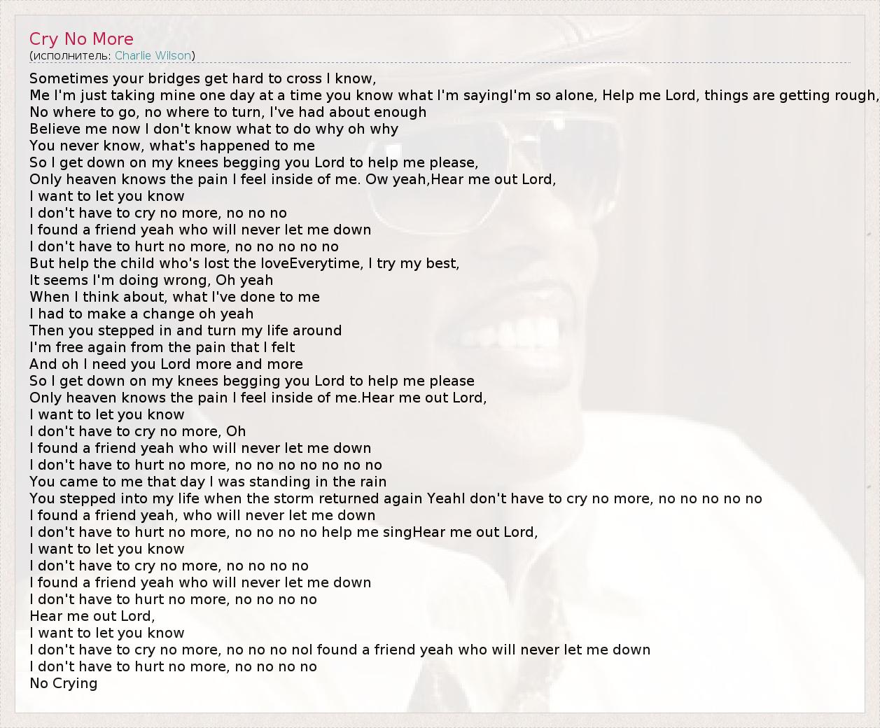 I don't have to cry no more, no no no noI found a friend yeah who will never let me down