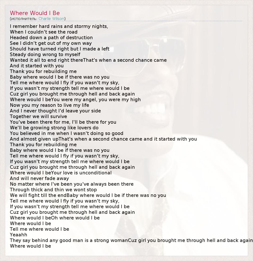 I remember hard rains and stormy nights, When I couldn't see the road Headed down a path of destruction See I didn't get out of my own way Should have turned right but I made a left Steady doing wrong to myself Wanted it all to end right thereThat's when a second chance came And it started with you Thank you for rebuilding me Baby where would I be if there was no you Tell me where would I fly if you wasn't my sky, If you wasn't my strength tell me where would I be Cuz girl you brought me through hell and back again Where would I beYou were my angel, you were my high Now you my reason to live my life And I never thought I'd leave your side Together we will survive You've been there for me, I'll be there for you We'll be growing strong like lovers do You believed in me when I wasn't doing so good And almost given upThat's when a second chance came and it started with you Thank you for rebuilding me Baby where would I be if there was no you Tell me where would I fly if you wasn't my sky, If you wasn't my strength tell me where would I be Cuz girl you brought me through hell and back again Where would I beYour love is unconditional And will never fade away No matter where I've been you've always been there Through thick and thin we wont stop We will fight till the endBaby where would I be if there was no you Tell me where would I fly if you wasn't my sky, If you wasn't my strength tell me where would I be Cuz girl you brought me through hell and back again Where would I beOh where would I be Where would I be Tell me where would I be Yeaahh They say behind any good man is a strong womanCuz girl you brought me through hell and back again Where would I be