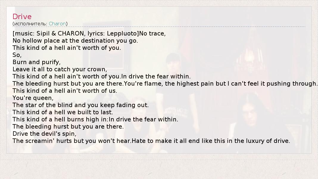 Это интересно:Участники группы Charon нашли друг друга в далеком 1992 году. Antti Karihtala, Teemu Hautamki, Pasi Sipil и Jasse Hast, живя в одном городе и имея схожие увлечения, сразу поняли, что могут вместе делать качественную и интересную музыку. Но для этого группе понадобился как минимум хороший вокалист. И тогда в жизни группы появился Juha-Pekka Leppluoto. Его сильный чувственный голос стал своеобразной визитной карточкой группы.... продолжение