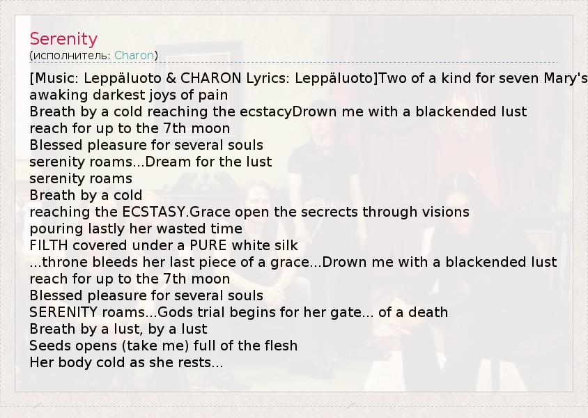 [Music: Leppäluoto & CHARON Lyrics: Leppäluoto]Two of a kind for seven Mary's awaking darkest joys of pain Breath by a cold reaching the ecstacyDrown me with a blackended lust reach for up to the 7th moon Blessed pleasure for several souls serenity roams...Dream for the lust serenity roams Breath by a cold reaching the ECSTASY.Grace open the secrects through visions pouring lastly her wasted time FILTH covered under a PURE white silk ...throne bleeds her last piece of a grace...Drown me with a blackended lust reach for up to the 7th moon Blessed pleasure for several souls SERENITY roams...Gods trial begins for her gate... of a death Breath by a lust, by a lust Seeds opens (take me) full of the flesh Her body cold as she rests...