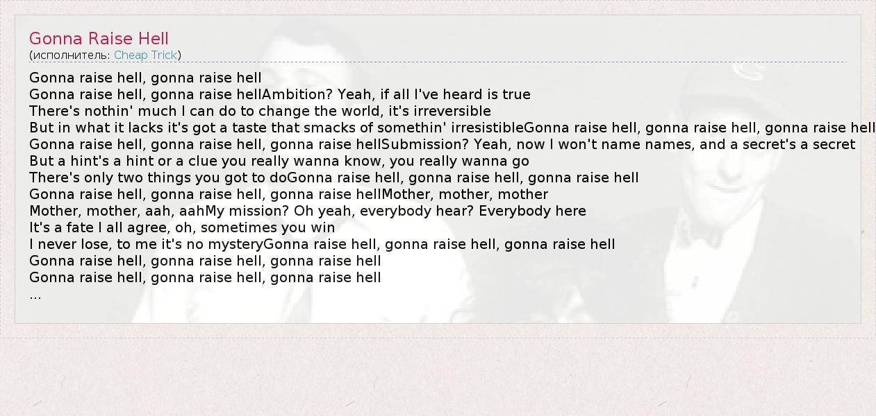 But in what it lacks it's got a taste that smacks of somethin' irresistibleGonna raise hell, gonna raise hell, gonna raise hell
