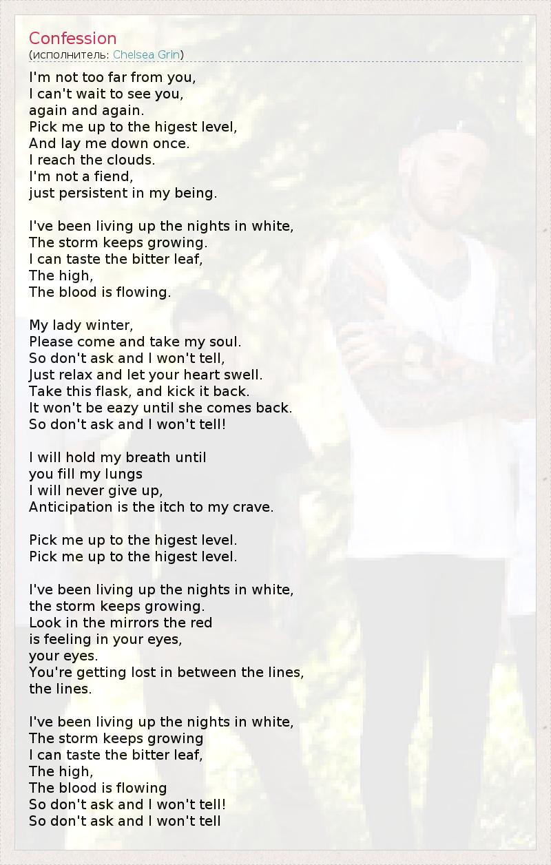 Я не далеко от тебя, Я не могу дождаться момента, когда увижу тебя, снова и снова. Подними меня на высший уровень, И опусти меня вниз, пока я не добрался до облаков. Я не дьявол, просто я стойкий, по своему существу. До окончания ночи я жил в белом, Но шторм продолжает расти. Я могу вкусить горькие листья,, Выше.. Кровь продолжает течь.. x2 О-о! Моя леди Зима, Пожалуйста, приди и забери мою душу. Поэтому не спрашивай, я ничего не скажу, Просто расслабься, и пусть твое сердце набухает. Возьми сей сосуд, и пни его обратно. Это не будет легко, пока она не вернется. Поэтому не спрашивай, я ничего не скажу, Я затаю дыхание до тех пор, пока Ты заполняешь мои легкие. Я никогда не сдамся, Потому что предвкушение и является тем, чего я жажду Подними меня на высший уровень, Подними меня на высший уровень, До окончания ночи я жил в белом, Но шторм продолжает расти. Посмотри в зеркало, Эта краснота.. твои глаза красные, Твои глаза.. Ты потерялся между строк, Между линиями. До окончания ночи я жил в белом, Но шторм продолжает расти. Я могу вкусить горькие листья,, Выше.. Кровь продолжает течь.. Поэтому не спрашивай, я ничего не скажу, Поэтому не спрашивай, я ничего не скажу,