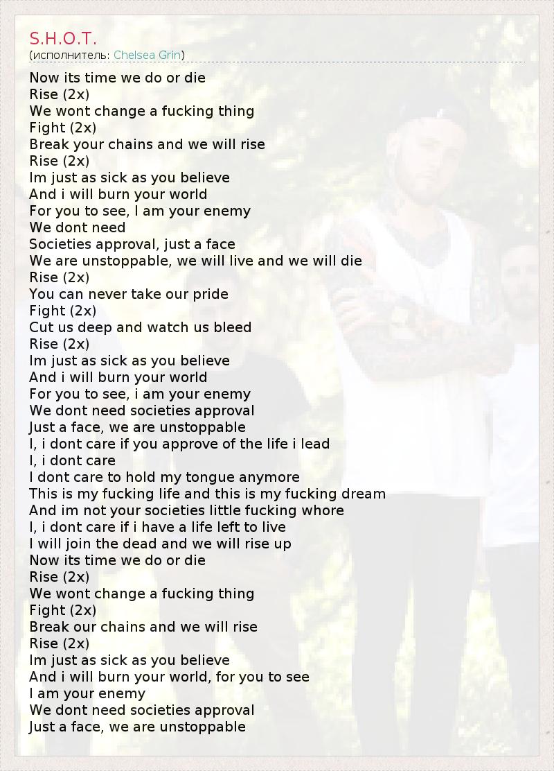 Now its time we do or die Rise (2x) We wont change a fucking thing Fight (2x) Break your chains and we will rise Rise (2x) Im just as sick as you believe And i will burn your world For you to see, I am your enemy We dont need Societies approval, just a face We are unstoppable, we will live and we will die Rise (2x) You can never take our pride Fight (2x) Cut us deep and watch us bleed Rise (2x) Im just as sick as you believe And i will burn your world For you to see, i am your enemy We dont need societies approval Just a face, we are unstoppable I, i dont care if you approve of the life i lead I, i dont care I dont care to hold my tongue anymore This is my fucking life and this is my fucking dream And im not your societies little fucking whore I, i dont care if i have a life left to live I will join the dead and we will rise up Now its time we do or die Rise (2x) We wont change a fucking thing Fight (2x) Break our chains and we will rise Rise (2x) Im just as sick as you believe And i will burn your world, for you to see I am your enemy We dont need societies approval Just a face, we are unstoppable