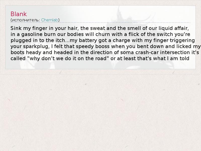 Это интересно:Chemlab - колдвэйв/индастриал рок группа из Вашингтона, появившаяся в 1989-ом году. Отцами основателями являются Дилан Томас Мор, Джэйрд Хэндриксон и Джо Фрэнк, который правда долго в группе не продержался. Вдохновленные пионерами индустриальной музыки, такими как Throbbing Gristle, группа принесла очень сильный экспериментальный отпечаток в свою музыку. Передвинувшись... продолжение