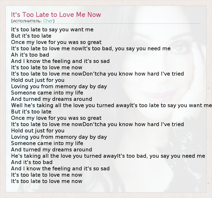 It's too late to say you want me But it's too late Once my love for you was so great It's too late to love me nowIt's too bad, you say you need me Ah it's too bad And I know the feeling and it's so sad It's too late to love me now It's too late to love me nowDon'tcha you know how hard I've tried Hold out just for you Loving you from memory day by day Someone came into my life And turned my dreams around Well he's taking all the love you turned awayIt's too late to say you want me But it's too late Once my love for you was so great It's too late to love me nowDon'tcha you know how hard I've tried Hold out just for you Loving you from memory day by day Someone came into my life And turned my dreams around He's taking all the love you turned awayIt's too bad, you say you need me And it's too bad And I know the feeling and it's so sad It's too late to love me now It's too late to love me now