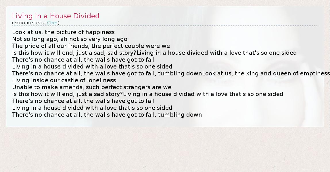 Look at us, the picture of happiness Not so long ago, ah not so very long ago The pride of all our friends, the perfect couple were we Is this how it will end, just a sad, sad story?Living in a house divided with a love that's so one sided There's no chance at all, the walls have got to fall Living in a house divided with a love that's so one sided There's no chance at all, the walls have got to fall, tumbling downLook at us, the king and queen of emptiness Living inside our castle of loneliness Unable to make amends, such perfect strangers are we Is this how it will end, just a sad story?Living in a house divided with a love that's so one sided There's no chance at all, the walls have got to fall Living in a house divided with a love that's so one sided There's no chance at all, the walls have got to fall, tumbling down