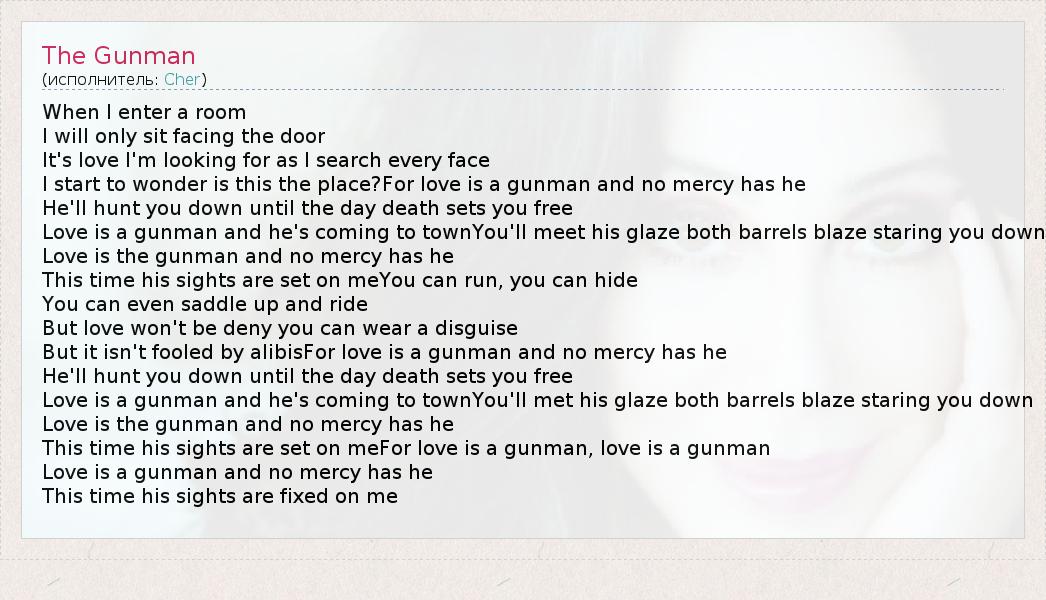 Love is a gunman and he's coming to townYou'll meet his glaze both barrels blaze staring you down