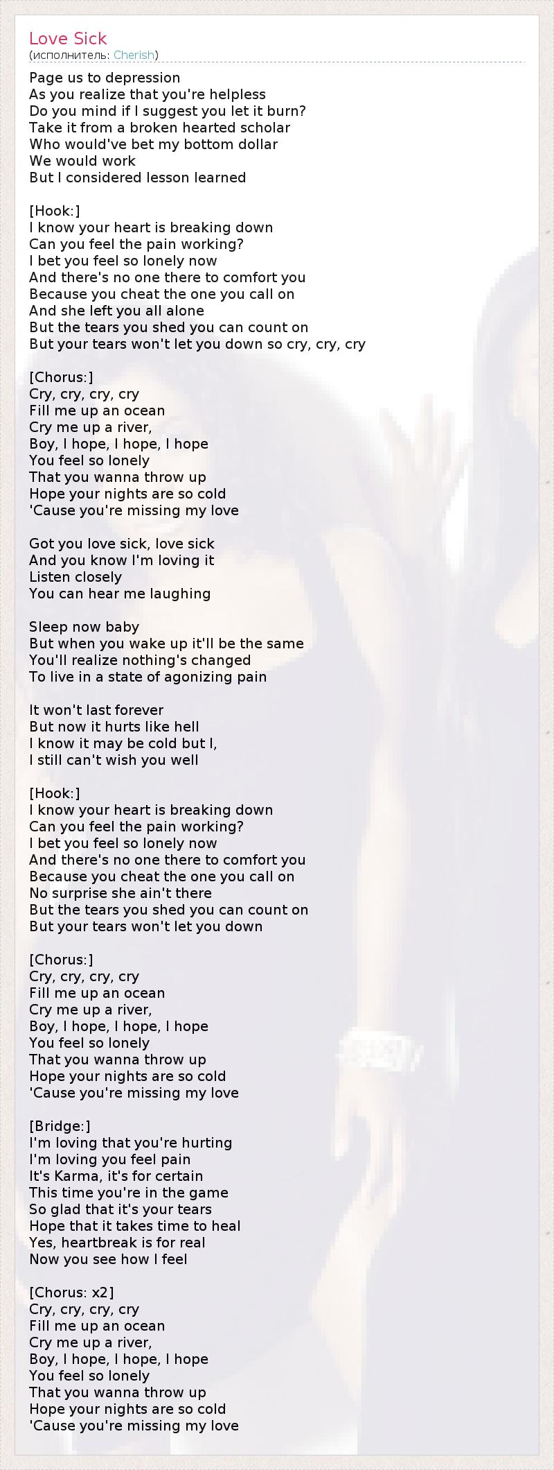 Page us to depression As you realize that you're helpless Do you mind if I suggest you let it burn? Take it from a broken hearted scholar Who would've bet my bottom dollar We would work But I considered lesson learned [Hook:] I know your heart is breaking down Can you feel the pain working? I bet you feel so lonely now And there's no one there to comfort you Because you cheat the one you call on And she left you all alone But the tears you shed you can count on But your tears won't let you down so cry, cry, cry [Chorus:] Cry, cry, cry, cry Fill me up an ocean Cry me up a river, Boy, I hope, I hope, I hope You feel so lonely That you wanna throw up Hope your nights are so cold 'Cause you're missing my love Got you love sick, love sick And you know I'm loving it Listen closely You can hear me laughing Sleep now baby But when you wake up it'll be the same You'll realize nothing's changed To live in a state of agonizing pain It won't last forever But now it hurts like hell I know it may be cold but I, I still can't wish you well [Hook:] I know your heart is breaking down Can you feel the pain working? I bet you feel so lonely now And there's no one there to comfort you Because you cheat the one you call on No surprise she ain't there But the tears you shed you can count on But your tears won't let you down [Chorus:] Cry, cry, cry, cry Fill me up an ocean Cry me up a river, Boy, I hope, I hope, I hope You feel so lonely That you wanna throw up Hope your nights are so cold 'Cause you're missing my love [Bridge:] I'm loving that you're hurting I'm loving you feel pain It's Karma, it's for certain This time you're in the game So glad that it's your tears Hope that it takes time to heal Yes, heartbreak is for real Now you see how I feel [Chorus: x2] Cry, cry, cry, cry Fill me up an ocean Cry me up a river, Boy, I hope, I hope, I hope You feel so lonely That you wanna throw up Hope your nights are so cold 'Cause you're missing my love