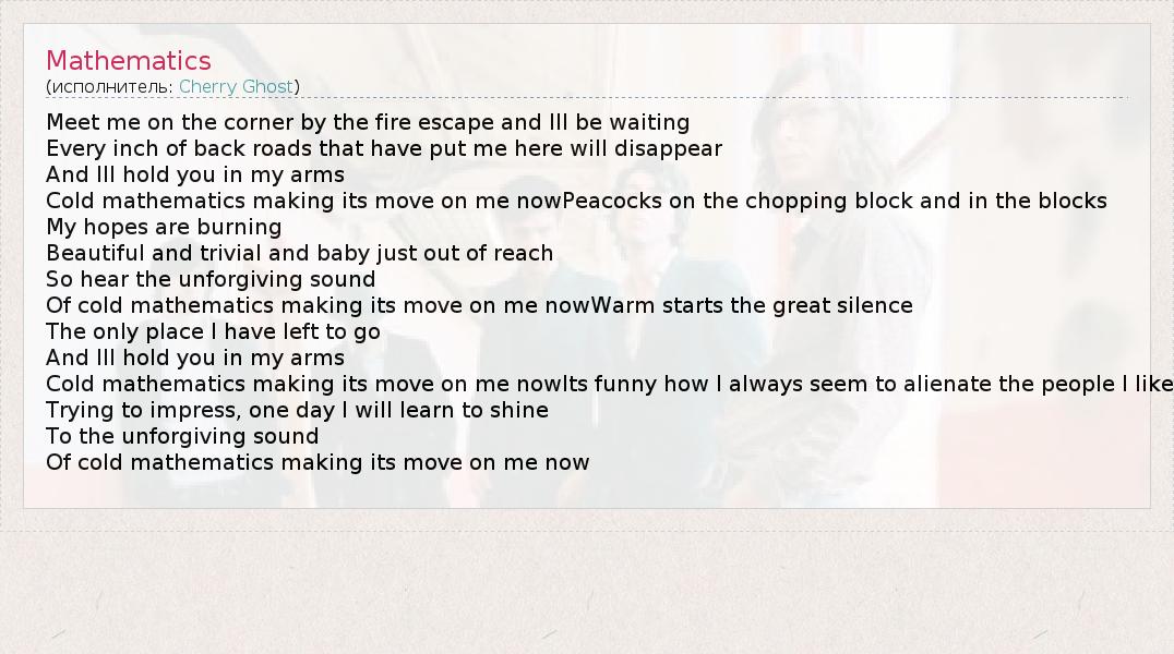 Meet me on the corner by the fire escape and Ill be waiting Every inch of back roads that have put me here will disappear And Ill hold you in my arms Cold mathematics making its move on me nowPeacocks on the chopping block and in the blocks My hopes are burning Beautiful and trivial and baby just out of reach So hear the unforgiving sound Of cold mathematics making its move on me nowWarm starts the great silence The only place I have left to go And Ill hold you in my arms Cold mathematics making its move on me nowIts funny how I always seem to alienate the people I like Trying to impress, one day I will learn to shine To the unforgiving sound Of cold mathematics making its move on me now
