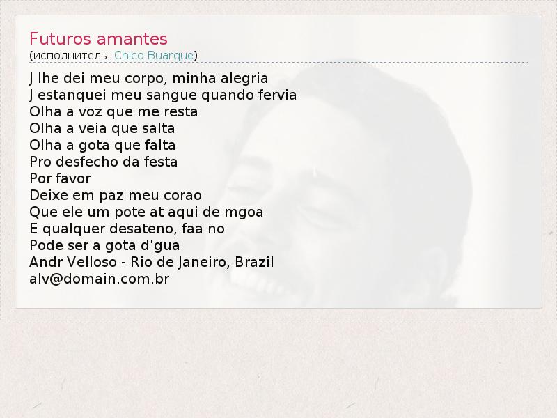 J lhe dei meu corpo, minha alegria J estanquei meu sangue quando fervia Olha a voz que me resta Olha a veia que salta Olha a gota que falta Pro desfecho da festa Por favor Deixe em paz meu corao Que ele um pote at aqui de mgoa E qualquer desateno, faa no Pode ser a gota d'gua Andr Velloso - Rio de Janeiro, Brazil alv@domain.com.br