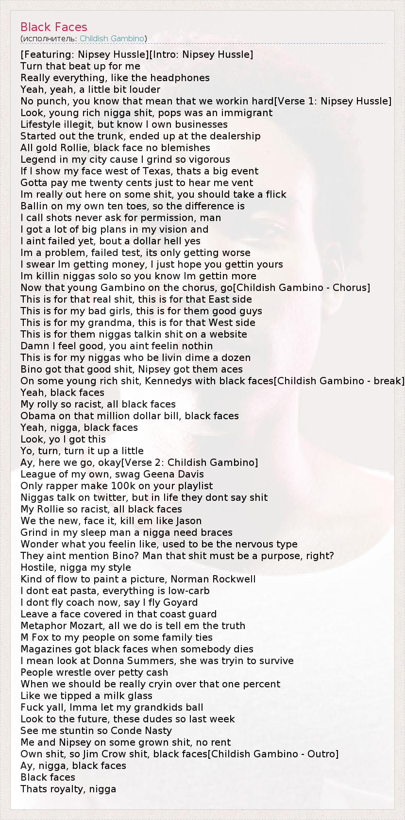 Own shit, so Jim Crow shit, black faces[Childish Gambino - Outro]