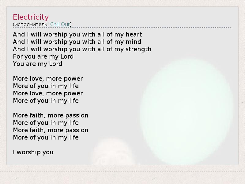 And I will worship you with all of my heart And I will worship you with all of my mind And I will worship you with all of my strength For you are my Lord You are my Lord More love, more power More of you in my life More love, more power More of you in my life More faith, more passion More of you in my life More faith, more passion More of you in my life I worship you