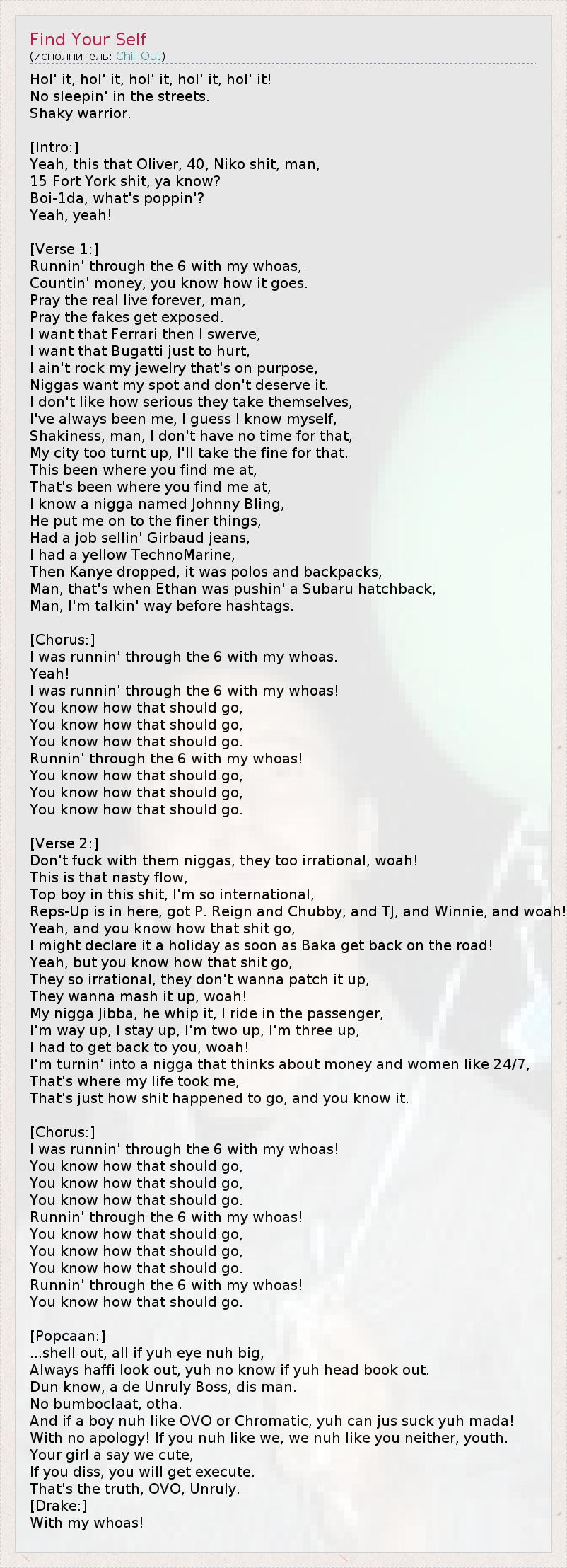 Погодь-погодь, сюда! На улицах не спят. Трусливый воин. [Вступление:] Да, это тема Оливера, Форти и Нико, чувак! 1 Тема 15 Форт Йорк, втыкаете? 2 Бой-Уонда, есть чё? 3 Ага, ага! [Куплет 1:] Разъезжаю по 6 со своими закадыками, 4 Считаю деньги, вы же знаете, как это бывает. Молюсь, чтобы реальные парни жили вечно, Молюсь, чтобы фальшивых разоблачили. Я хочу "Феррари", буду на ней рассекать, Я хочу "Бугатти", только чтобы поддеть вас, Я не ношу свои украшения специально для вас, Ниггеры хотят занять моё место, но они его не заслуживают. Мне не нравится, насколько серьёзно они себя воспринимают, Я всегда был собой, думаю, я познал себя, Бздо, чувак, у меня нет на него времени, Мой город слишком разошёлся, выписывайте за это штраф на моё имя. Тут-то меня и отыскали, Тут вы меня и отыскали, Я знаю черномазого по имени Джонни Цацки, Он приучил меня к роскошным вещам, Раньше я продавал джинсы "Жирбу", 5 У меня были жёлтые "ТекноМарин", 6 А потом вышел альбом Канье, и все стали носить рубашки-поло и рюкзаки, Чувак, Итан тогда ещё водил хэтчбек "Субару", Чувак, я говорю о времени, когда о хэштегах и не слыхивали. [Припев:] Я разъезжал по 6 со своими закадыками. Да! Я разъезжал по 6 со своими закадыками! Вы знаете, как это должно быть, Вы знаете, как это должно быть, Вы знаете, как это должно быть. Разъезжал по 6 со своими закадыками! Вы знаете, как это должно быть, Вы знаете, как это должно быть, Вы знаете, как это должно быть. [Куплет 2:] Не лезьте к этим ниггерам, они отмороженные, ого! Это грязные рифмы, Смотрящий здесь, я международен. Здесь "Репс-Ап": Пи-Рейн, Чабби и Ти-Джей, и Винни, и ого! 7 Да, вы знаете, как это бывает, Я, может, объявлю праздник, когда Бака вернётся к нам! Да, но вы же знаете, как это бывает, Они настолько отмороженные, что не хотят ничего сглаживать, А хотят месива, ого! Мой ниггер Джибба за рулём, я еду на пассажирском сиденье, Я впереди, я на подъёме, я далеко зашёл, даже слишком, Я должен вернуться к вам, ого! Я превращаюсь в черномазого, который думает о деньгах и женщинах круглые сутки, Вот, до чего довела меня жизнь, Как кривая вывела, и вы понимаете. [Припев:] Я разъезжал по 6 со своими закадыками! Вы знаете, как это должно быть, Вы знаете, как это должно быть, Вы знаете, как это должно быть. Разъезжал по 6 со своими закадыками! Вы знаете, как это должно быть, Вы знаете, как это должно быть, Вы знаете, как это должно быть. Разъезжал по 6 со своими закадыками! Вы знаете, как это должно быть. [Popcaan:] ...выбьем. А если у тебя не хватает глаз, То всегда будь начеку. Ты же не знаешь, назначили ли цену за твою голову. Не знаешь Буйного Босса, этого парня. Он не какой-то вышкребок. А если парнишке не нравится OVO или Кроматик, можешь отыметь свою мамку! Извиняться не буду! Если мы тебе не нравимся, ты нам тоже не нравишься, малой. Твоя девчонка говорит, что мы прелесть, Наедешь на нас — тебя прикончат. Вот она, правда. OVO, Анрули. 8 [Drake:] Со своими закадыками! 1 — Ноа 40 Шебиб – давний друг Дрейка, продюсер многих его композиций. Оливер эль-Хатиб — близкий друг и менеджер Дрейка. 2 — 15 Fort York — фешенебельный жилой комплекс в Торонто. 3 — Boi-1da — псевдоним Маттью Джеу Сэмюэльса, канадского хип-хоп–продюсера ямайского происхождения. 4 — 6 — прозвище Торонто, родного города Дрейка, в рэп-тусовке; возникло из-за наличия цифры "6" в кодах города — 416 и 647. 5 — Marithé+François Girbaud — французский модный бренд, обанкротившийся в 2012 году. 6 