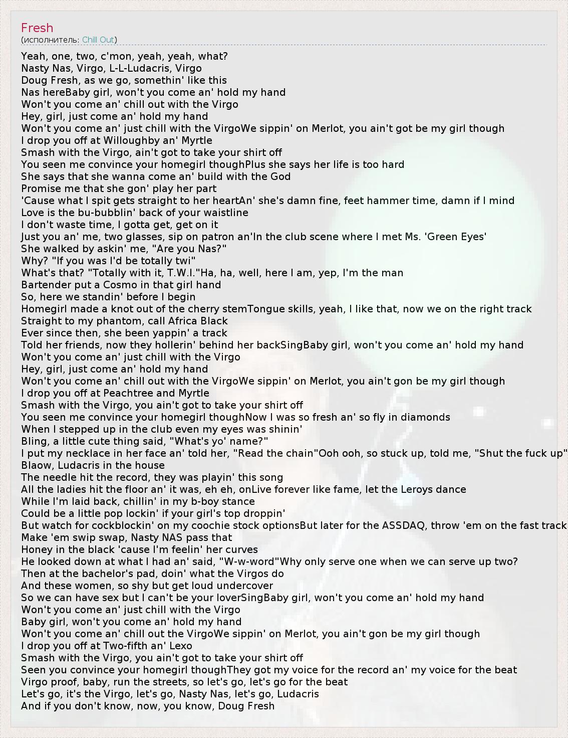 Yeah, one, two, c'mon, yeah, yeah, what? Nasty Nas, Virgo, L-L-Ludacris, Virgo Doug Fresh, as we go, somethin' like this Nas hereBaby girl, won't you come an' hold my hand Won't you come an' chill out with the Virgo Hey, girl, just come an' hold my hand Won't you come an' just chill with the VirgoWe sippin' on Merlot, you ain't got be my girl though I drop you off at Willoughby an' Myrtle Smash with the Virgo, ain't got to take your shirt off You seen me convince your homegirl thoughPlus she says her life is too hard She says that she wanna come an' build with the God Promise me that she gon' play her part 'Cause what I spit gets straight to her heartAn' she's damn fine, feet hammer time, damn if I mind Love is the bu-bubblin' back of your waistline I don't waste time, I gotta get, get on it Just you an' me, two glasses, sip on patron an'In the club scene where I met Ms. 'Green Eyes' She walked by askin' me, "Are you Nas?" Why? "If you was I'd be totally twi" What's that? "Totally with it, T.W.I."Ha, ha, well, here I am, yep, I'm the man Bartender put a Cosmo in that girl hand So, here we standin' before I begin Homegirl made a knot out of the cherry stemTongue skills, yeah, I like that, now we on the right track Straight to my phantom, call Africa Black Ever since then, she been yappin' a track Told her friends, now they hollerin' behind her backSingBaby girl, won't you come an' hold my hand Won't you come an' just chill with the Virgo Hey, girl, just come an' hold my hand Won't you come an' chill out with the VirgoWe sippin' on Merlot, you ain't gon be my girl though I drop you off at Peachtree and Myrtle Smash with the Virgo, you ain't got to take your shirt off You seen me convince your homegirl thoughNow I was so fresh an' so fly in diamonds When I stepped up in the club even my eyes was shinin' Bling, a little cute thing said, "What's yo' name?" I put my necklace in her face an' told her, "Read the chain"Ooh ooh, so stuck up, told me, "Shut the fuck up" Blaow, Ludacris in the house The needle hit the record, they was playin' this song All the ladies hit the floor an' it was, eh eh, onLive forever like fame, let the Leroys dance While I'm laid back, chillin' in my b-boy stance Could be a little pop lockin' if your girl's top droppin' But watch for cockblockin' on my coochie stock optionsBut later for the ASSDAQ, throw 'em on the fast track Make 'em swip swap, Nasty NAS pass that Honey in the black 'cause I'm feelin' her curves He looked down at what I had an' said, "W-w-word"Why only serve one when we can serve up two? Then at the bachelor's pad, doin' what the Virgos do And these women, so shy but get loud undercover So we can have sex but I can't be your loverSingBaby girl, won't you come an' hold my hand Won't you come an' just chill with the Virgo Baby girl, won't you come an' hold my hand Won't you come an' chill out the VirgoWe sippin' on Merlot, you ain't gon be my girl though I drop you off at Two-fifth an' Lexo Smash with the Virgo, you ain't got to take your shirt off Seen you convince your homegirl thoughThey got my voice for the record an' my voice for the beat Virgo proof, baby, run the streets, so let's go, let's go for the beat Let's go, it's the Virgo, let's go, Nasty Nas, let's go, Ludacris And if you don't know, now, you know, Doug Fresh
