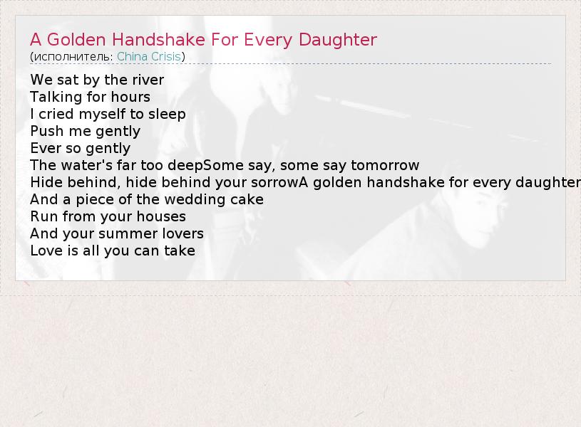 ГлавнаяИсполнителиChina CrisisA Golden Handshake For Every Daughter