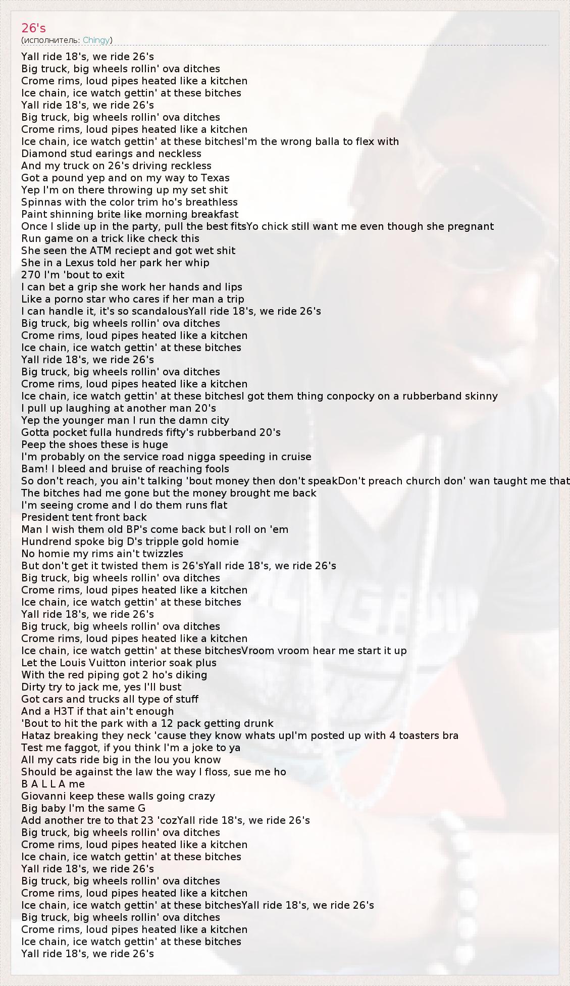 Yall ride 18's, we ride 26's Big truck, big wheels rollin' ova ditches Crome rims, loud pipes heated like a kitchen Ice chain, ice watch gettin' at these bitches Yall ride 18's, we ride 26's Big truck, big wheels rollin' ova ditches Crome rims, loud pipes heated like a kitchen Ice chain, ice watch gettin' at these bitchesI'm the wrong balla to flex with Diamond stud earings and neckless And my truck on 26's driving reckless Got a pound yep and on my way to Texas Yep I'm on there throwing up my set shit Spinnas with the color trim ho's breathless Paint shinning brite like morning breakfast Once I slide up in the party, pull the best fitsYo chick still want me even though she pregnant Run game on a trick like check this She seen the ATM reciept and got wet shit She in a Lexus told her park her whip 270 I'm 'bout to exit I can bet a grip she work her hands and lips Like a porno star who cares if her man a trip I can handle it, it's so scandalousYall ride 18's, we ride 26's Big truck, big wheels rollin' ova ditches Crome rims, loud pipes heated like a kitchen Ice chain, ice watch gettin' at these bitches Yall ride 18's, we ride 26's Big truck, big wheels rollin' ova ditches Crome rims, loud pipes heated like a kitchen Ice chain, ice watch gettin' at these bitchesI got them thing conpocky on a rubberband skinny I pull up laughing at another man 20's Yep the younger man I run the damn city Gotta pocket fulla hundreds fifty's rubberband 20's Peep the shoes these is huge I'm probably on the service road nigga speeding in cruise Bam! I bleed and bruise of reaching fools So don't reach, you ain't talking 'bout money then don't speakDon't preach church don' wan taught me that The bitches had me gone but the money brought me back I'm seeing crome and I do them runs flat President tent front back Man I wish them old BP's come back but I roll on 'em Hundrend spoke big D's tripple gold homie No homie my rims ain't twizzles But don't get it twisted them is 26'sYall ride 18's, we ride 26's Big truck, big wheels rollin' ova ditches Crome rims, loud pipes heated like a kitchen Ice chain, ice watch gettin' at these bitches Yall ride 18's, we ride 26's Big truck, big wheels rollin' ova ditches Crome rims, loud pipes heated like a kitchen Ice chain, ice watch gettin' at these bitchesVroom vroom hear me start it up Let the Louis Vuitton interior soak plus With the red piping got 2 ho's diking Dirty try to jack me, yes I'll bust Got cars and trucks all type of stuff And a H3T if that ain't enough 'Bout to hit the park with a 12 pack getting drunk Hataz breaking they neck 'cause they know whats upI'm posted up with 4 toasters bra Test me faggot, if you think I'm a joke to ya All my cats ride big in the lou you know Should be against the law the way I floss, sue me ho B A L L A me Giovanni keep these walls going crazy Big baby I'm the same G Add another tre to that 23 'cozYall ride 18's, we ride 26's Big truck, big wheels rollin' ova ditches Crome rims, loud pipes heated like a kitchen Ice chain, ice watch gettin' at these bitches Yall ride 18's, we ride 26's Big truck, big wheels rollin' ova ditches Crome rims, loud pipes heated like a kitchen Ice chain, ice watch gettin' at these bitchesYall ride 18's, we ride 26's Big truck, big wheels rollin' ova ditches Crome rims, loud pipes heated like a kitchen Ice chain, ice watch gettin' at these bitches Yall ride 18's, we ride 26's