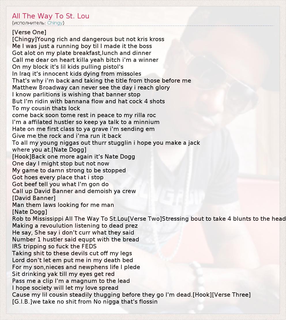 [Verse One] [Chingy]Young rich and dangerous but not kris kross Me I was just a running boy til I made it the boss Got alot on my plate breakfast,lunch and dinner Call me dear on heart killa yeah bitch i'm a winner On my block it's lil kids pulling pistol's In Iraq it's innocent kids dying from missoles That's why i'm back and taking the title from those before me Matthew Broadway can never see the day i reach glory I know parlitions is wishing that banner stop But I'm ridin with bannana flow and hat cock 4 shots To my cousin thats lock come back soon tome rest in peace to my rilla roc I'm a affilated hustler so keep ya talk to a minnium Hate on me first class to ya grave i'm sending em Give me the rock and i'ma run it back To all my young niggas out thurr stugglin i hope you make a jack where you at.[Nate Dogg] [Hook]Back one more again it's Nate Dogg One day I might stop but not now My game to damn strong to be stopped Got hoes every place that i stop Got beef tell you what I'm gon do Call up David Banner and demoish ya crew [David Banner] Man them laws looking for me man [Nate Dogg] Rob to Mississippi All The Way To St.Lou[Verse Two]Stressing bout to take 4 blunts to the head Making a revoulution listening to dead prez He say, She say i don't curr what they said Number 1 hustler said equpt with the bread IRS tripping so fuck the FEDS Taking shit to these devils cut off my legs Lord don't let em put me in my death bed For my son,nieces and newphens life I plede Sit drinking yak till my eyes get red Pass me a clip I'm a magnum to the lead I hope society will let my love spread Cause my lil cousin steadily thugging before they go I'm dead.[Hook][Verse Three] [G.I.B.]we take no shit from No nigga that's flossin