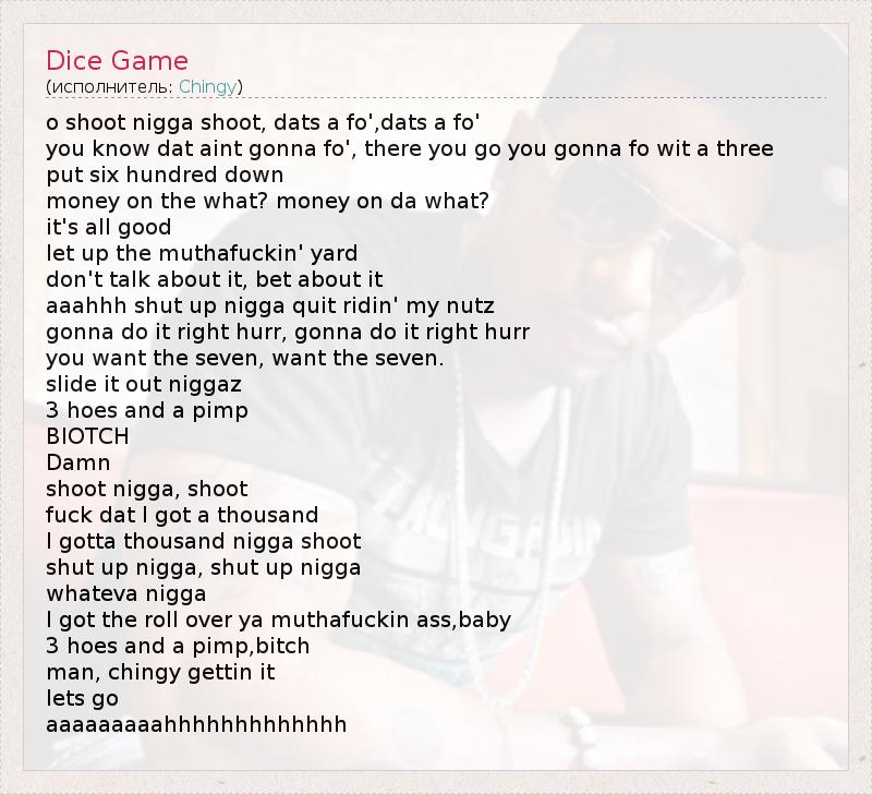o shoot nigga shoot, dats a fo',dats a fo' you know dat aint gonna fo', there you go you gonna fo wit a three put six hundred down money on the what? money on da what? it's all good let up the muthafuckin' yard don't talk about it, bet about it aaahhh shut up nigga quit ridin' my nutz gonna do it right hurr, gonna do it right hurr you want the seven, want the seven. slide it out niggaz 3 hoes and a pimp BIOTCH Damn shoot nigga, shoot fuck dat I got a thousand I gotta thousand nigga shoot shut up nigga, shut up nigga whateva nigga I got the roll over ya muthafuckin ass,baby 3 hoes and a pimp,bitch man, chingy gettin it lets go aaaaaaaaahhhhhhhhhhhhh