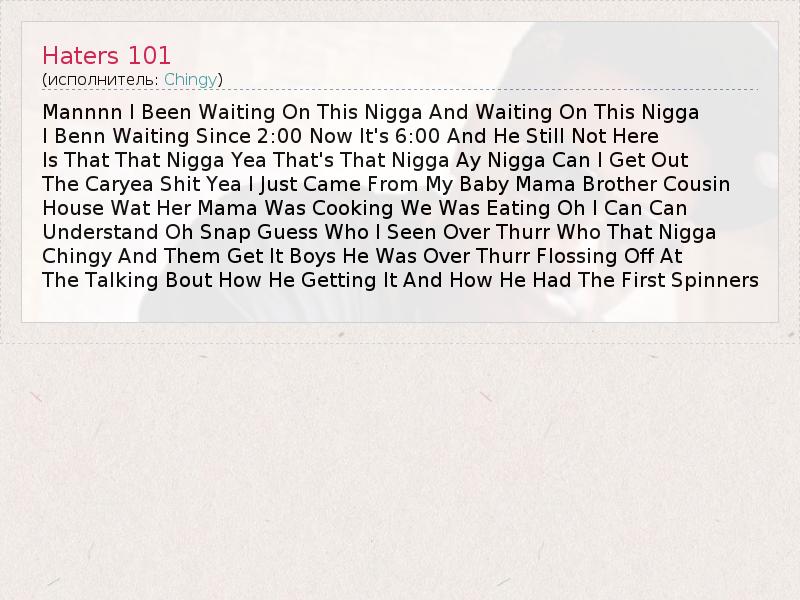 Mannnn I Been Waiting On This Nigga And Waiting On This Nigga I Benn Waiting Since 2:00 Now It's 6:00 And He Still Not Here Is That That Nigga Yea That's That Nigga Ay Nigga Can I Get Out The Caryea Shit Yea I Just Came From My Baby Mama Brother Cousin House Wat Her Mama Was Cooking We Was Eating Oh I Can Can Understand Oh Snap Guess Who I Seen Over Thurr Who That Nigga Chingy And Them Get It Boys He Was Over Thurr Flossing Off At The Talking Bout How He Getting It And How He Had The First Spinners