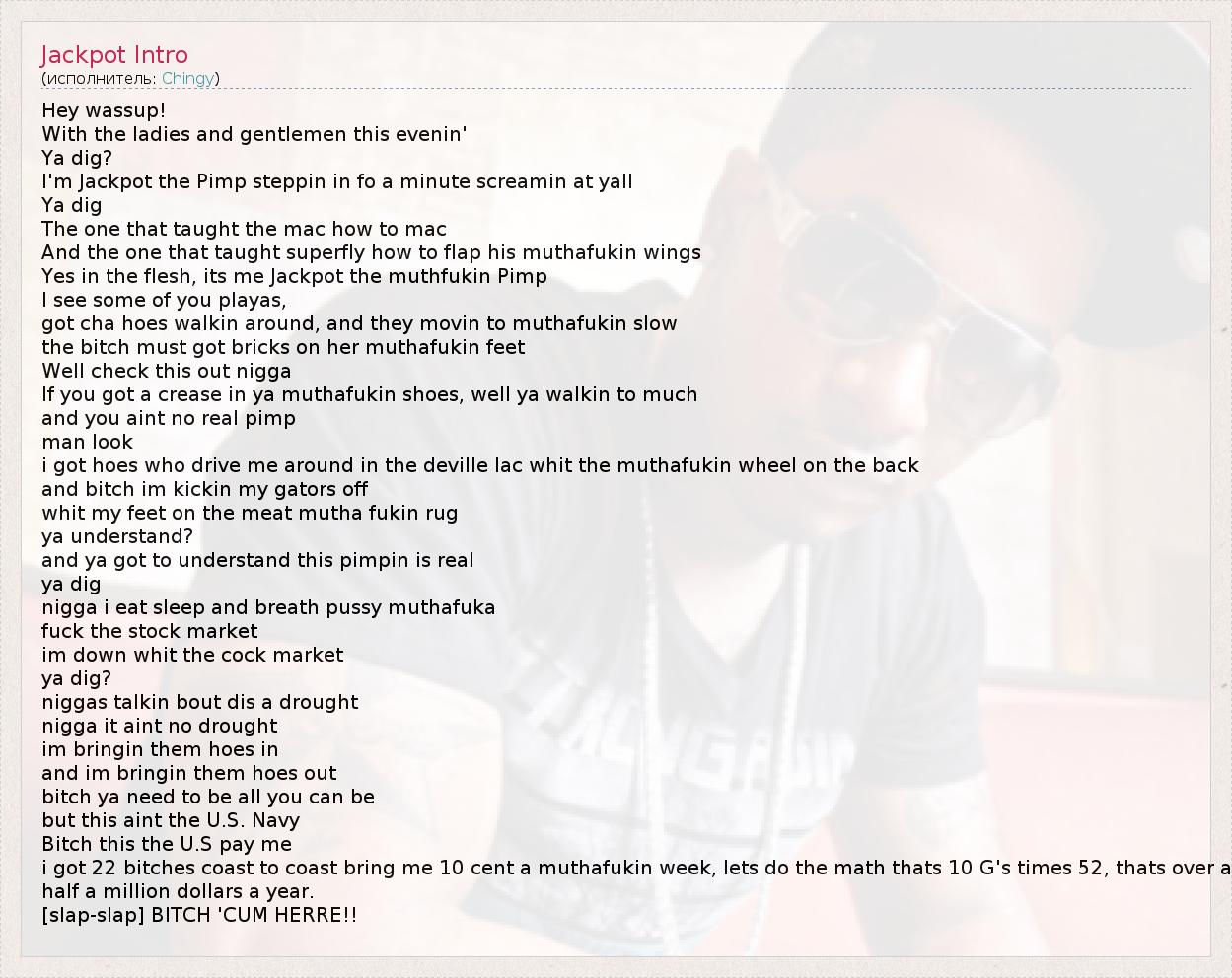 Hey wassup! With the ladies and gentlemen this evenin' Ya dig? I'm Jackpot the Pimp steppin in fo a minute screamin at yall Ya dig The one that taught the mac how to mac And the one that taught superfly how to flap his muthafukin wings Yes in the flesh, its me Jackpot the muthfukin Pimp I see some of you playas, got cha hoes walkin around, and they movin to muthafukin slow the bitch must got bricks on her muthafukin feet Well check this out nigga If you got a crease in ya muthafukin shoes, well ya walkin to much and you aint no real pimp man look i got hoes who drive me around in the deville lac whit the muthafukin wheel on the back and bitch im kickin my gators off whit my feet on the meat mutha fukin rug ya understand? and ya got to understand this pimpin is real ya dig nigga i eat sleep and breath pussy muthafuka fuck the stock market im down whit the cock market ya dig? niggas talkin bout dis a drought nigga it aint no drought im bringin them hoes in and im bringin them hoes out bitch ya need to be all you can be but this aint the U.S. Navy Bitch this the U.S pay me i got 22 bitches coast to coast bring me 10 cent a muthafukin week, lets do the math thats 10 G's times 52, thats over a half a million dollars a year. [slap-slap] BITCH 'CUM HERRE!!