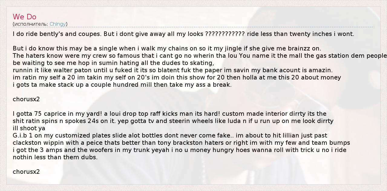 i got the 3 amps and the woofers in my trunk yeyah i no u money hungry hoes wanna roll with trick u no i ride