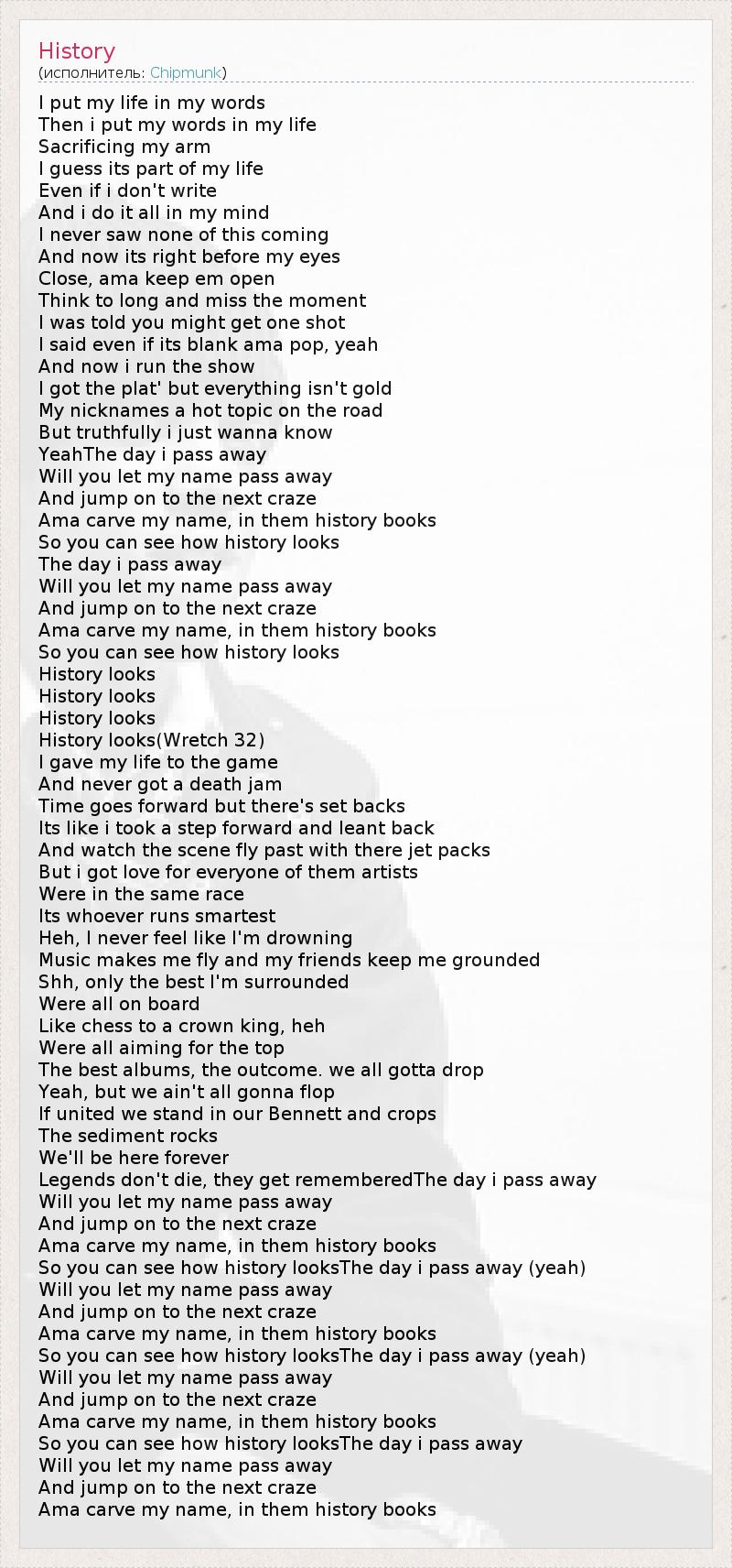 I put my life in my words Then i put my words in my life Sacrificing my arm I guess its part of my life Even if i don't write And i do it all in my mind I never saw none of this coming And now its right before my eyes Close, ama keep em open Think to long and miss the moment I was told you might get one shot I said even if its blank ama pop, yeah And now i run the show I got the plat' but everything isn't gold My nicknames a hot topic on the road But truthfully i just wanna know YeahThe day i pass away Will you let my name pass away And jump on to the next craze Ama carve my name, in them history books So you can see how history looks The day i pass away Will you let my name pass away And jump on to the next craze Ama carve my name, in them history books So you can see how history looks History looks History looks History looks History looks(Wretch 32) I gave my life to the game And never got a death jam Time goes forward but there's set backs Its like i took a step forward and leant back And watch the scene fly past with there jet packs But i got love for everyone of them artists Were in the same race Its whoever runs smartest Heh, I never feel like I'm drowning Music makes me fly and my friends keep me grounded Shh, only the best I'm surrounded Were all on board Like chess to a crown king, heh Were all aiming for the top The best albums, the outcome. we all gotta drop Yeah, but we ain't all gonna flop If united we stand in our Bennett and crops The sediment rocks We'll be here forever Legends don't die, they get rememberedThe day i pass away Will you let my name pass away And jump on to the next craze Ama carve my name, in them history books So you can see how history looksThe day i pass away (yeah) Will you let my name pass away And jump on to the next craze Ama carve my name, in them history books So you can see how history looksThe day i pass away (yeah) Will you let my name pass away And jump on to the next craze Ama carve my name, in them history books So you can see how history looksThe day i pass away Will you let my name pass away And jump on to the next craze Ama carve my name, in them history books