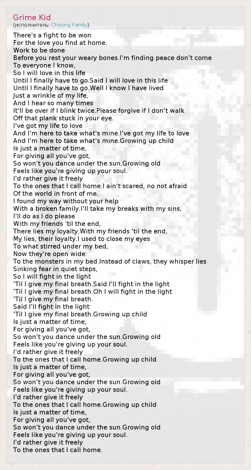 There's a fight to be won For the love you find at home. Work to be done Before you rest your weary bones.I'm finding peace don't come To everyone I know, So I will love in this life Until I finally have to go.Said I will love in this life Until I finally have to go.Well I know I have lived Just a wrinkle of my life, And I hear so many times It'll be over if I blink twice.Please forgive if I don't walk Off that plank stuck in your eye. I've got my life to love And I'm here to take what's mine.I've got my life to love And I'm here to take what's mine.Growing up child Is just a matter of time, For giving all you've got, So won't you dance under the sun.Growing old Feels like you're giving up your soul. I'd rather give it freely To the ones that I call home.I ain't scared, no not afraid Of the world in front of me. I found my way without your help With a broken family.I'll take my breaks with my sins, I'll do as I do please With my friends 'til the end, There lies my loyalty.With my friends 'til the end, My lies, their loyalty.I used to close my eyes To what stirred under my bed, Now they're open wide To the monsters in my bed.Instead of claws, they whisper lies Sinking fear in quiet steps, So I will fight in the light 'Til I give my final breath.Said I'll fight in the light 'Til I give my final breath.Oh I will fight in the light 'Til I give my final breath. Said I'll fight in the light 'Til I give my final breath.Growing up child Is just a matter of time, For giving all you've got, So won't you dance under the sun.Growing old Feels like you're giving up your soul. I'd rather give it freely To the ones that I call home.Growing up child Is just a matter of time, For giving all you've got, So won't you dance under the sun.Growing old Feels like you're giving up your soul. I'd rather give it freely To the ones that I call home.Growing up child Is just a matter of time, For giving all you've got, So won't you dance under the sun.Growing old Feels like you're giving up your soul. I'd rather give it freely To the ones that I call home.