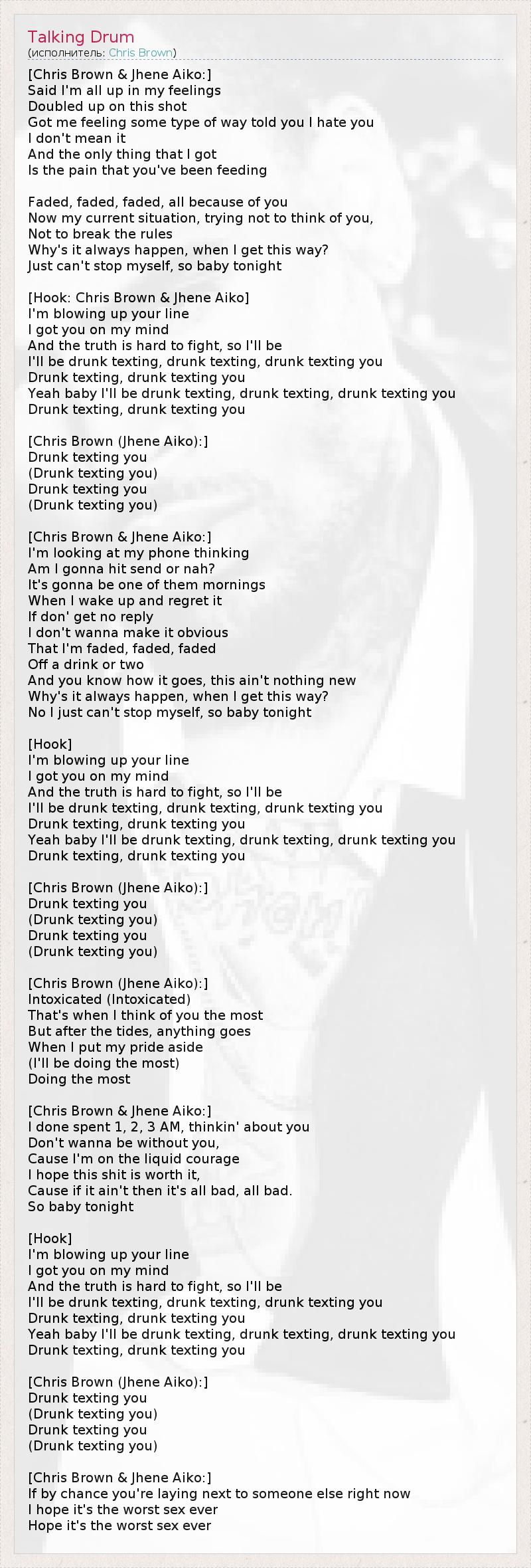 [Chris Brown & Jhene Aiko:] Said I'm all up in my feelings Doubled up on this shot Got me feeling some type of way told you I hate you I don't mean it And the only thing that I got Is the pain that you've been feeding Faded, faded, faded, all because of you Now my current situation, trying not to think of you, Not to break the rules Why's it always happen, when I get this way? Just can't stop myself, so baby tonight [Hook: Chris Brown & Jhene Aiko] I'm blowing up your line I got you on my mind And the truth is hard to fight, so I'll be I'll be drunk texting, drunk texting, drunk texting you Drunk texting, drunk texting you Yeah baby I'll be drunk texting, drunk texting, drunk texting you Drunk texting, drunk texting you [Chris Brown (Jhene Aiko):] Drunk texting you (Drunk texting you) Drunk texting you (Drunk texting you) [Chris Brown & Jhene Aiko:] I'm looking at my phone thinking Am I gonna hit send or nah? It's gonna be one of them mornings When I wake up and regret it If don' get no reply I don't wanna make it obvious That I'm faded, faded, faded Off a drink or two And you know how it goes, this ain't nothing new Why's it always happen, when I get this way? No I just can't stop myself, so baby tonight [Hook] I'm blowing up your line I got you on my mind And the truth is hard to fight, so I'll be I'll be drunk texting, drunk texting, drunk texting you Drunk texting, drunk texting you Yeah baby I'll be drunk texting, drunk texting, drunk texting you Drunk texting, drunk texting you [Chris Brown (Jhene Aiko):] Drunk texting you (Drunk texting you) Drunk texting you (Drunk texting you) [Chris Brown (Jhene Aiko):] Intoxicated (Intoxicated) That's when I think of you the most But after the tides, anything goes When I put my pride aside (I'll be doing the most) Doing the most [Chris Brown & Jhene Aiko:] I done spent 1, 2, 3 AM, thinkin' about you Don't wanna be without you, Cause I'm on the liquid courage I hope this shit is worth it, Сause if it ain't then it's all bad, all bad. So baby tonight [Hook] I'm blowing up your line I got you on my mind And the truth is hard to fight, so I'll be I'll be drunk texting, drunk texting, drunk texting you Drunk texting, drunk texting you Yeah baby I'll be drunk texting, drunk texting, drunk texting you Drunk texting, drunk texting you [Chris Brown (Jhene Aiko):] Drunk texting you (Drunk texting you) Drunk texting you (Drunk texting you) [Chris Brown & Jhene Aiko:] If by chance you're laying next to someone else right now I hope it's the worst sex ever Hope it's the worst sex ever