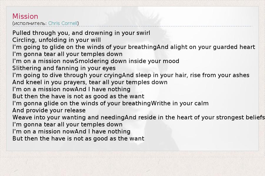 Это интересно:Chris Cornell (урождённый Christopher John Boyle, 20 июля 1964 года) - американский гитарист, композитор и вокалист. Был участником таких групп, как Soundgarden (1984 - 1997, 2010 - …) и Audioslave (2001 - 2007). Одно время являлся фронтмэном группы Temple of the Dog (1990 - 1992). Начал свою музыкальную карьеру как барабанщик, но позже сменил профиль на гитариста и вокалиста. Выпустил... продолжение