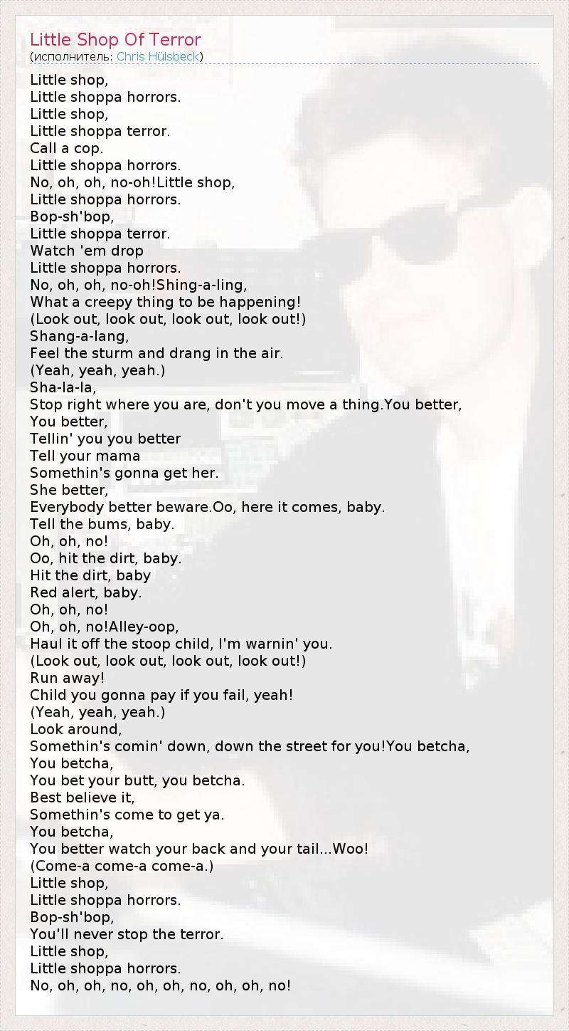 Little shop, Little shoppa horrors. Little shop, Little shoppa terror. Call a cop. Little shoppa horrors. No, oh, oh, no-oh!Little shop, Little shoppa horrors. Bop-sh'bop, Little shoppa terror. Watch 'em drop Little shoppa horrors. No, oh, oh, no-oh!Shing-a-ling, What a creepy thing to be happening! (Look out, look out, look out, look out!) Shang-a-lang, Feel the sturm and drang in the air. (Yeah, yeah, yeah.) Sha-la-la, Stop right where you are, don't you move a thing.You better, You better, Tellin' you you better Tell your mama Somethin's gonna get her. She better, Everybody better beware.Oo, here it comes, baby. Tell the bums, baby. Oh, oh, no! Oo, hit the dirt, baby. Hit the dirt, baby Red alert, baby. Oh, oh, no! Oh, oh, no!Alley-oop, Haul it off the stoop child, I'm warnin' you. (Look out, look out, look out, look out!) Run away! Child you gonna pay if you fail, yeah! (Yeah, yeah, yeah.) Look around, Somethin's comin' down, down the street for you!You betcha, You betcha, You bet your butt, you betcha. Best believe it, Somethin's come to get ya. You betcha, You better watch your back and your tail...Woo! (Come-a come-a come-a.) Little shop, Little shoppa horrors. Bop-sh'bop, You'll never stop the terror. Little shop, Little shoppa horrors. No, oh, oh, no, oh, oh, no, oh, oh, no!