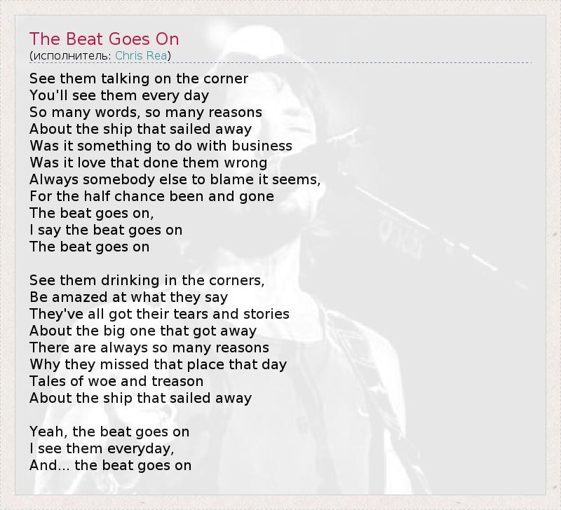 See them talking on the corner You'll see them every day So many words, so many reasons About the ship that sailed away Was it something to do with business Was it love that done them wrong Always somebody else to blame it seems, For the half chance been and gone The beat goes on, I say the beat goes on The beat goes on See them drinking in the corners, Be amazed at what they say They've all got their tears and stories About the big one that got away There are always so many reasons Why they missed that place that day Tales of woe and treason About the ship that sailed away Yeah, the beat goes on I see them everyday, And... the beat goes on