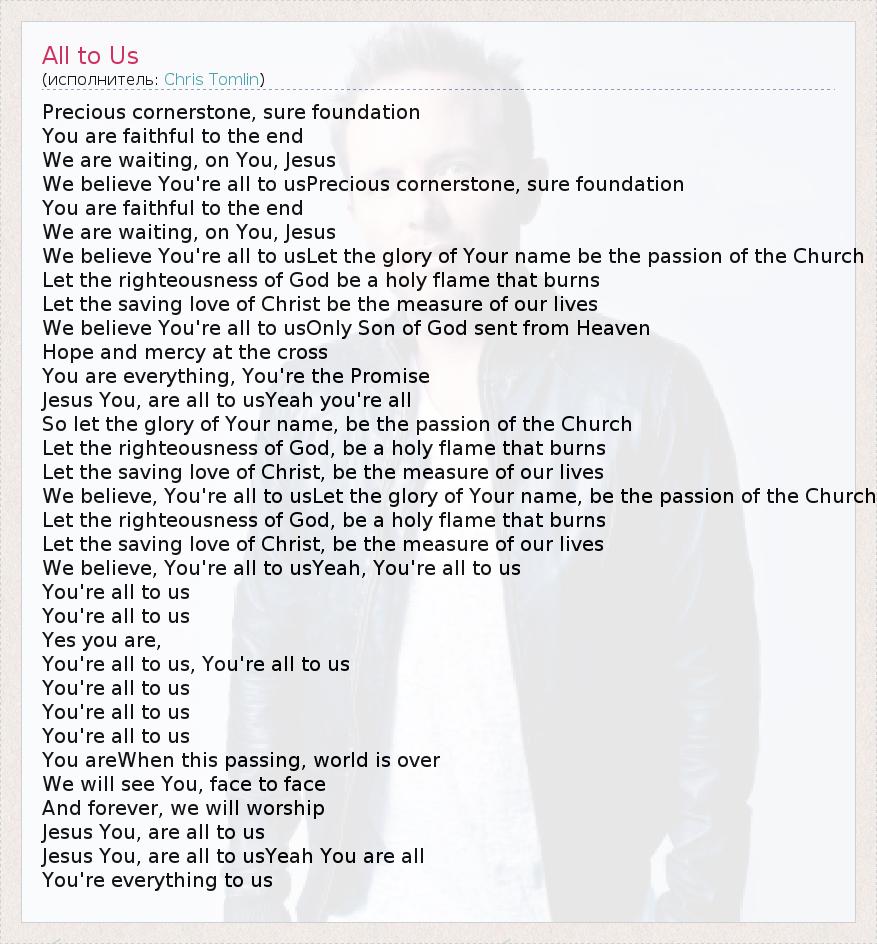 Это интересно:“Я хочу быть отражением Бога, как луна, которая, не имея своего света, отражает свет солнца” Крис ТомлинКристофер Двэйн Томлин родился 4 мая 1972-го в Техасе в семье, где помимо него росли еще два ребенка. Первую свою гитару он получил в подарок от отца, когда был еще одиннадцатилетним мальчиком,... продолжение