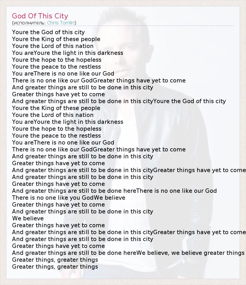 Это интересно:“Я хочу быть отражением Бога, как луна, которая, не имея своего света, отражает свет солнца” Крис ТомлинКристофер Двэйн Томлин родился 4 мая 1972-го в Техасе в семье, где помимо него росли еще два ребенка. Первую свою гитару он получил в подарок от отца, когда был еще одиннадцатилетним мальчиком,... продолжение