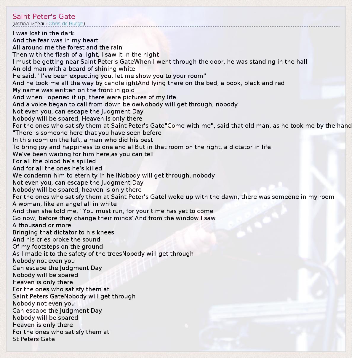 I was lost in the dark And the fear was in my heart All around me the forest and the rain Then with the flash of a light, I saw it in the night I must be getting near Saint Peter's GateWhen I went through the door, he was standing in the hall An old man with a beard of shining white He said, "I've been expecting you, let me show you to your room" And he took me all the way by candlelightAnd lying there on the bed, a book, black and red My name was written on the front in gold And when I opened it up, there were pictures of my life And a voice began to call from down belowNobody will get through, nobody Not even you, can escape the Judgment Day Nobody will be spared, Heaven is only there For the ones who satisfy them at Saint Peter's Gate"Come with me", said that old man, as he took me by the hand "There is someone here that you have seen before In this room on the left, a man who did his best To bring joy and happiness to one and allBut in that room on the right, a dictator in life We've been waiting for him here,as you can tell For all the blood he's spilled And for all the ones he's killed We condemn him to eternity in hellNobody will get through, nobody Not even you, can escape the Judgment Day Nobody will be spared, heaven is only there For the ones who satisfy them at Saint Peter's GateI woke up with the dawn, there was someone in my room A woman, like an angel all in white And then she told me, "You must run, for your time has yet to come Go now, before they change their minds"And from the window I saw A thousand or more Bringing that dictator to his knees And his cries broke the sound Of my footsteps on the ground As I made it to the safety of the treesNobody will get through Nobody not even you Can escape the Judgment Day Nobody will be spared Heaven is only there For the ones who satisfy them at Saint Peters GateNobody will get through Nobody not even you Can escape the Judgment Day Nobody will be spared Heaven is only there For the ones who satisfy them at St Peters Gate