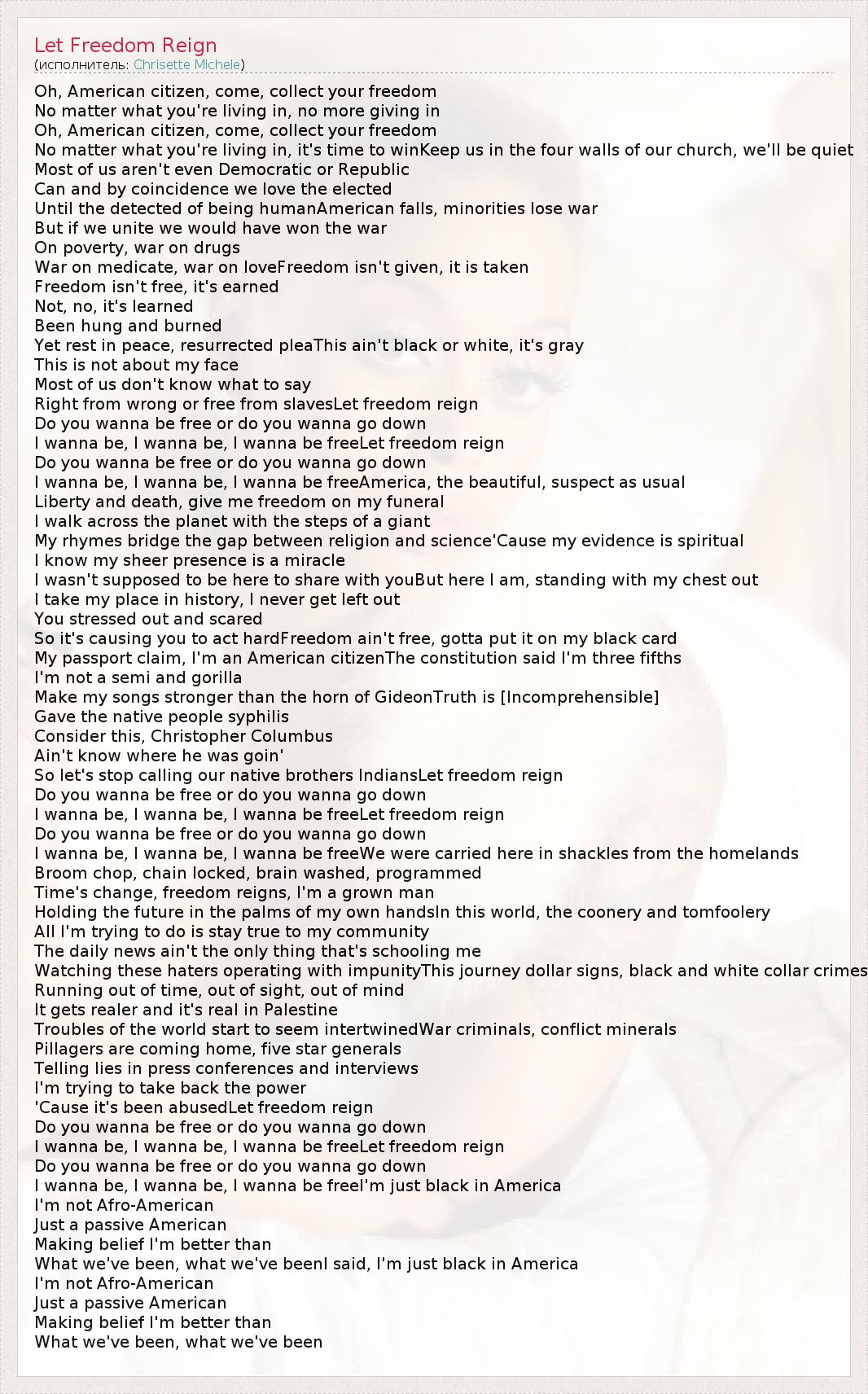 Oh, American citizen, come, collect your freedom No matter what you're living in, no more giving in Oh, American citizen, come, collect your freedom No matter what you're living in, it's time to winKeep us in the four walls of our church, we'll be quiet Most of us aren't even Democratic or Republic Can and by coincidence we love the elected Until the detected of being humanAmerican falls, minorities lose war But if we unite we would have won the war On poverty, war on drugs War on medicate, war on loveFreedom isn't given, it is taken Freedom isn't free, it's earned Not, no, it's learned Been hung and burned Yet rest in peace, resurrected pleaThis ain't black or white, it's gray This is not about my face Most of us don't know what to say Right from wrong or free from slavesLet freedom reign Do you wanna be free or do you wanna go down I wanna be, I wanna be, I wanna be freeLet freedom reign Do you wanna be free or do you wanna go down I wanna be, I wanna be, I wanna be freeAmerica, the beautiful, suspect as usual Liberty and death, give me freedom on my funeral I walk across the planet with the steps of a giant My rhymes bridge the gap between religion and science'Cause my evidence is spiritual I know my sheer presence is a miracle I wasn't supposed to be here to share with youBut here I am, standing with my chest out I take my place in history, I never get left out You stressed out and scared So it's causing you to act hardFreedom ain't free, gotta put it on my black card My passport claim, I'm an American citizenThe constitution said I'm three fifths I'm not a semi and gorilla Make my songs stronger than the horn of GideonTruth is [Incomprehensible] Gave the native people syphilis Consider this, Christopher Columbus Ain't know where he was goin' So let's stop calling our native brothers IndiansLet freedom reign Do you wanna be free or do you wanna go down I wanna be, I wanna be, I wanna be freeLet freedom reign Do you wanna be free or do you wanna go down I wanna be, I wanna be, I wanna be freeWe were carried here in shackles from the homelands Broom chop, chain locked, brain washed, programmed Time's change, freedom reigns, I'm a grown man Holding the future in the palms of my own handsIn this world, the coonery and tomfoolery All I'm trying to do is stay true to my community The daily news ain't the only thing that's schooling me Watching these haters operating with impunityThis journey dollar signs, black and white collar crimes Running out of time, out of sight, out of mind It gets realer and it's real in Palestine Troubles of the world start to seem intertwinedWar criminals, conflict minerals Pillagers are coming home, five star generals Telling lies in press conferences and interviews I'm trying to take back the power 'Cause it's been abusedLet freedom reign Do you wanna be free or do you wanna go down I wanna be, I wanna be, I wanna be freeLet freedom reign Do you wanna be free or do you wanna go down I wanna be, I wanna be, I wanna be freeI'm just black in America I'm not Afro-American Just a passive American Making belief I'm better than What we've been, what we've beenI said, I'm just black in America I'm not Afro-American Just a passive American Making belief I'm better than What we've been, what we've been