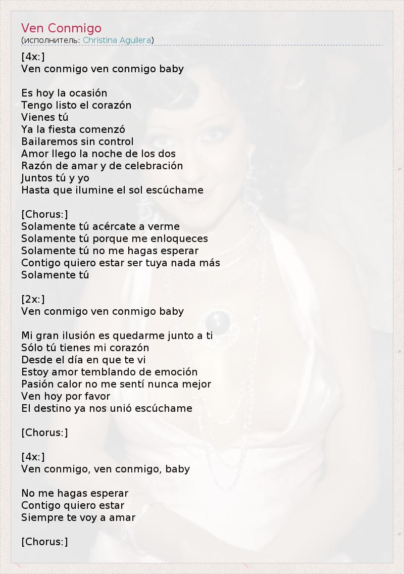 [4x:] Ven conmigo ven conmigo baby Es hoy la ocasión Tengo listo el corazón Vienes tú Ya la fiesta comenzó Bailaremos sin control Amor llego la noche de los dos Razón de amar y de celebración Juntos tú y yo Hasta que ilumine el sol escúchame [Chorus:] Solamente tú acércate a verme Solamente tú porque me enloqueces Solamente tú no me hagas esperar Contigo quiero estar ser tuya nada más Solamente tú [2x:] Ven conmigo ven conmigo baby Mi gran ilusión es quedarme junto a ti Sólo tú tienes mi corazón Desde el día en que te vi Estoy amor temblando de emoción Pasión calor no me sentí nunca mejor Ven hoy por favor El destino ya nos unió escúchame [Chorus:] [4x:] Ven conmigo, ven conmigo, baby No me hagas esperar Contigo quiero estar Siempre te voy a amar [Chorus:]