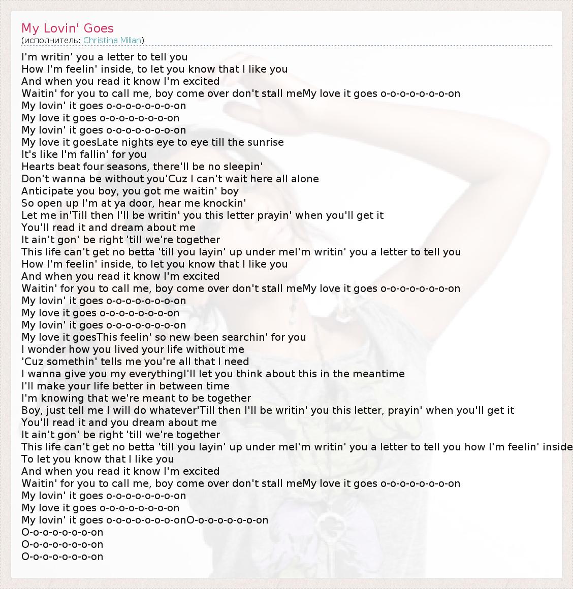 I'm writin' you a letter to tell you How I'm feelin' inside, to let you know that I like you And when you read it know I'm excited Waitin' for you to call me, boy come over don't stall meMy love it goes o-o-o-o-o-o-o-on My lovin' it goes o-o-o-o-o-o-o-on My love it goes o-o-o-o-o-o-o-on My lovin' it goes o-o-o-o-o-o-o-on My love it goesLate nights eye to eye till the sunrise It's like I'm fallin' for you Hearts beat four seasons, there'll be no sleepin' Don't wanna be without you'Cuz I can't wait here all alone Anticipate you boy, you got me waitin' boy So open up I'm at ya door, hear me knockin' Let me in'Till then I'll be writin' you this letter prayin' when you'll get it You'll read it and dream about me It ain't gon' be right 'till we're together This life can't get no betta 'till you layin' up under meI'm writin' you a letter to tell you How I'm feelin' inside, to let you know that I like you And when you read it know I'm excited Waitin' for you to call me, boy come over don't stall meMy love it goes o-o-o-o-o-o-o-on My lovin' it goes o-o-o-o-o-o-o-on My love it goes o-o-o-o-o-o-o-on My lovin' it goes o-o-o-o-o-o-o-on My love it goesThis feelin' so new been searchin' for you I wonder how you lived your life without me 'Cuz somethin' tells me you're all that I need I wanna give you my everythingI'll let you think about this in the meantime I'll make your life better in between time I'm knowing that we're meant to be together Boy, just tell me I will do whatever'Till then I'll be writin' you this letter, prayin' when you'll get it You'll read it and you dream about me It ain't gon' be right 'till we're together This life can't get no betta 'till you layin' up under meI'm writin' you a letter to tell you how I'm feelin' inside To let you know that I like you And when you read it know I'm excited Waitin' for you to call me, boy come over don't stall meMy love it goes o-o-o-o-o-o-o-on My lovin' it goes o-o-o-o-o-o-o-on My love it goes o-o-o-o-o-o-o-on My lovin' it goes o-o-o-o-o-o-o-onO-o-o-o-o-o-o-on O-o-o-o-o-o-o-on O-o-o-o-o-o-o-on O-o-o-o-o-o-o-on