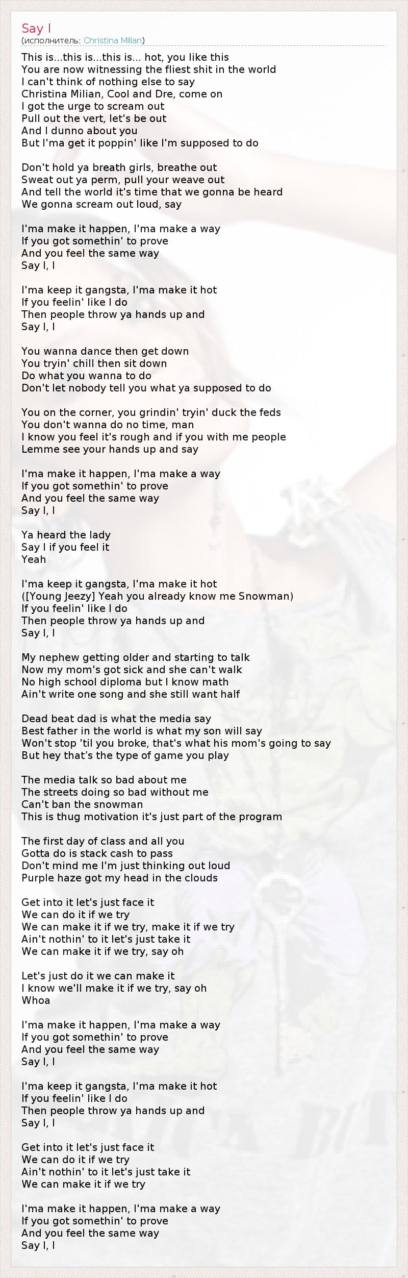 Это... это... это круто, тебе должно понравиться Сейчас ты свидетель самой крутой фишки в мире Я думаю о том, чтобы сказать Christina Milian, Cool and Dre, давайте Я хочу закричать, Перевернуть все вверх дном, пойти развеяться И я тебя не знаю, Но я собираюсь заняться сексом, как и хотела Не задерживайте дыхание, девчонки, дышите свободно Избавьтесь от завивки, снимайте шиньоны Пора сказать миру во всеуслышание Мы собираемся громко заявить, сказать Я это сделаю, я встану на этот путь Если тебе есть что доказать И думаешь также Скажи я, я Я стану сама собой, я зажгу Если вы также думаете, Тогда люди поднимите руки вверх и Скажите я, я Ты хочешь потанцевать, а потом лечь Ты пытаешься тусоваться, а потом садишься Делай, что тебе нравится Не позволяй никому указывать тебе, что делать Ты ходишь по притонам, ты банчишь, укрываешься от федералов Ты не хочешь ничего делать, нет времени, блин Я знаю, вам кажется, это грубым, но если вы со мной, люди Поднимите руки вверх и скажите Я это сделаю, я встану на этот путь Если тебе есть что доказать И думаешь также Скажи я, я Вы слышали девушку Скажите, если думаете также Да! Я стану сама собой, я зажгу ([Young Jeezy] Да, ты уже меня знаешь Снежок) Если вы также думаете, Тогда люди поднимите руки вверх и Скажите я, я Моя племянница подросла и учится говорить Теперь моя матушка заболела и не может ходить Не имею среднего образования, но знаю математику Не написал ни одну песню, а она все же хочет половину «Ужасный отец» - говорят в СМИ «Самый лучший папа в мире!» - мой сынишка скажет «Не тормози, пока не сломаешься!» - его мамочка промолвит Но эй, это игра, в которую ты играешь СМИ говорит обо мне много плохого Без меня улицы погибнут Не могу избавить их от наркодилеров Это мотивация грабителя, это всего лишь часть программы Это первый классный день и вы все Должны потратить кучу бабла Не обращайте на меня внимание, это просто мысли вслух Марихуана уносит меня далеко в облака Пойми это, давай просто примем это Мы сможем сделать это, если попытаемся Мы сможем сделать это, если попытаемся, сделаем это, если попытаемся Но в этом ничего нет, давай просто потребуем это Мы сможем сделать это, если попытаемся, скажи, о! Давай просто сделаем это, мы сможем, Я знаю, мы сделаем это, если постараемся, скажи, о! Оооооооо Я это сделаю, я встану на этот путь Если тебе есть что доказать И думаешь также Скажи я, я Я стану сама собой, я зажгу Если вы также думаете, Тогда люди поднимите руки вверх и Скажите я, я Пойми это, давай просто примем это Мы сможем сделать это, если попытаемся В этом ничего нет, давай просто потребуем это Мы сможем сделать это, если попытаемся Я это сделаю, я встану на этот путь Если тебе есть что доказать И думаешь также Скажи я, я