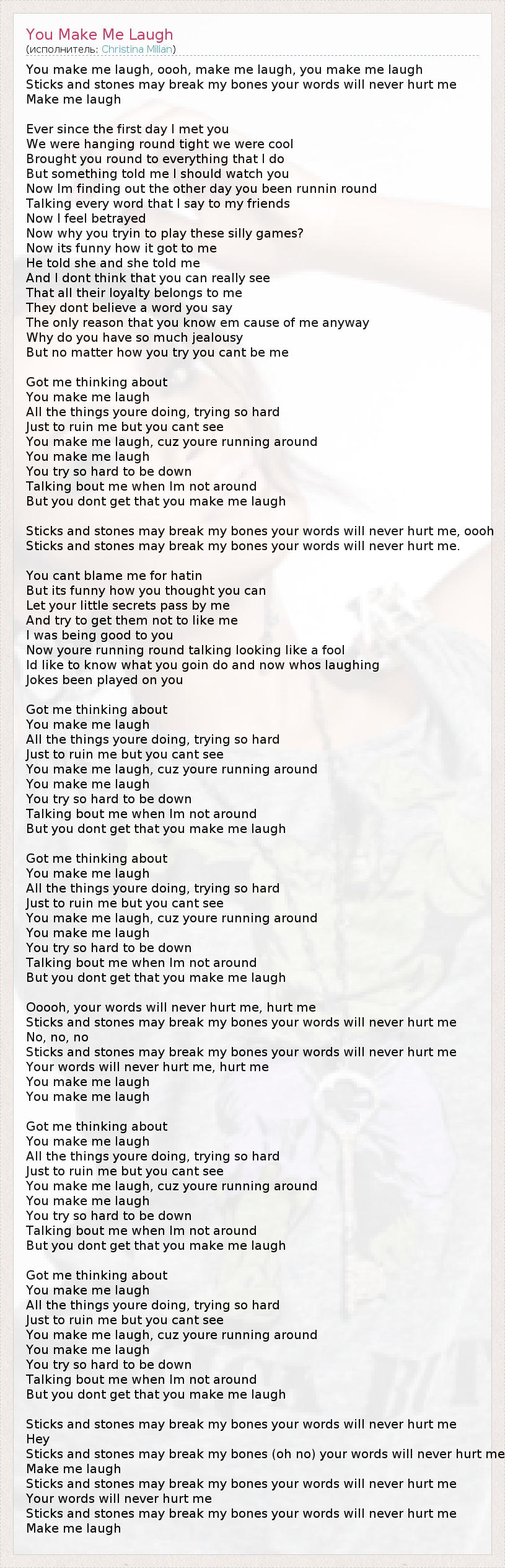 You make me laugh, oooh, make me laugh, you make me laugh Sticks and stones may break my bones your words will never hurt me Make me laugh Ever since the first day I met you We were hanging round tight we were cool Brought you round to everything that I do But something told me I should watch you Now Im finding out the other day you been runnin round Talking every word that I say to my friends Now I feel betrayed Now why you tryin to play these silly games? Now its funny how it got to me He told she and she told me And I dont think that you can really see That all their loyalty belongs to me They dont believe a word you say The only reason that you know em cause of me anyway Why do you have so much jealousy But no matter how you try you cant be me Got me thinking about You make me laugh All the things youre doing, trying so hard Just to ruin me but you cant see You make me laugh, cuz youre running around You make me laugh You try so hard to be down Talking bout me when Im not around But you dont get that you make me laugh Sticks and stones may break my bones your words will never hurt me, oooh Sticks and stones may break my bones your words will never hurt me. You cant blame me for hatin But its funny how you thought you can Let your little secrets pass by me And try to get them not to like me I was being good to you Now youre running round talking looking like a fool Id like to know what you goin do and now whos laughing Jokes been played on you Got me thinking about You make me laugh All the things youre doing, trying so hard Just to ruin me but you cant see You make me laugh, cuz youre running around You make me laugh You try so hard to be down Talking bout me when Im not around But you dont get that you make me laugh Got me thinking about You make me laugh All the things youre doing, trying so hard Just to ruin me but you cant see You make me laugh, cuz youre running around You make me laugh You try so hard to be down Talking bout me when Im not around But you dont get that you make me laugh Ooooh, your words will never hurt me, hurt me Sticks and stones may break my bones your words will never hurt me No, no, no Sticks and stones may break my bones your words will never hurt me Your words will never hurt me, hurt me You make me laugh You make me laugh Got me thinking about You make me laugh All the things youre doing, trying so hard Just to ruin me but you cant see You make me laugh, cuz youre running around You make me laugh You try so hard to be down Talking bout me when Im not around But you dont get that you make me laugh Got me thinking about You make me laugh All the things youre doing, trying so hard Just to ruin me but you cant see You make me laugh, cuz youre running around You make me laugh You try so hard to be down Talking bout me when Im not around But you dont get that you make me laugh Sticks and stones may break my bones your words will never hurt me Hey Sticks and stones may break my bones (oh no) your words will never hurt me Make me laugh Sticks and stones may break my bones your words will never hurt me Your words will never hurt me Sticks and stones may break my bones your words will never hurt me Make me laugh
