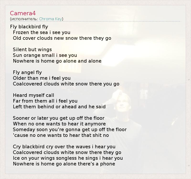 Fly blackbird fly Frozen the sea i see you Old cover clouds new snow there they go Silent but wings Sun orange small i see you Nowhere is home go alone and alone Fly angel fly Older than me i feel you Coalcovered clouds white snow there you go Heard myself call Far from them all i feel you Left them behind or ahead and he said Sooner or later you get up off the floor When no one wants to hear it anymore Someday soon you're gonna get up off the floor 'cause no one wants to hear that shit no Cry blackbird cry over the waves i hear you Coalcovered clouds white snow there they go Ice on your wings songless he sings i hear you Nowhere is home go alone there's a phone