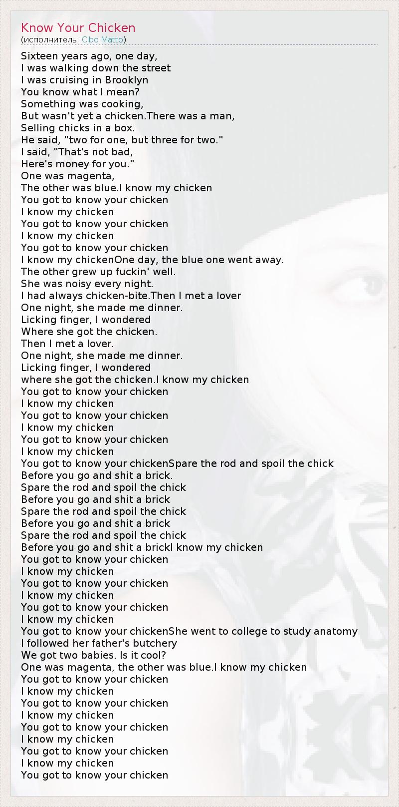 А как ты думаешь, о чем песня "Know Your Chicken" ?