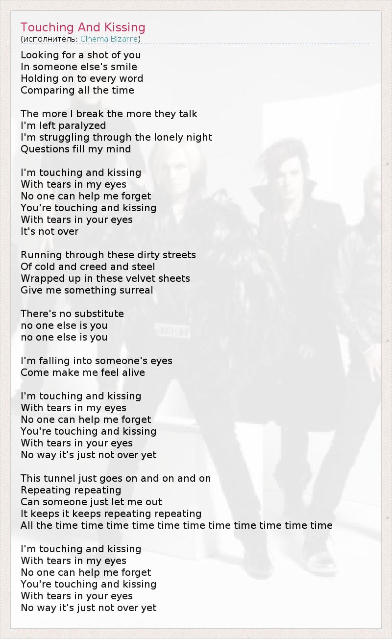 Looking for a shot of you In someone else's smile Holding on to every word Comparing all the time The more I break the more they talk I'm left paralyzed I'm struggling through the lonely night Questions fill my mind I'm touching and kissing With tears in my eyes No one can help me forget You're touching and kissing With tears in your eyes It's not over Running through these dirty streets Of cold and creed and steel Wrapped up in these velvet sheets Give me something surreal There's no substitute no one else is you no one else is you I'm falling into someone's eyes Come make me feel alive I'm touching and kissing With tears in my eyes No one can help me forget You're touching and kissing With tears in your eyes No way it's just not over yet This tunnel just goes on and on and on Repeating repeating Can someone just let me out It keeps it keeps repeating repeating All the time time time time time time time time time time time I'm touching and kissing With tears in my eyes No one can help me forget You're touching and kissing With tears in your eyes No way it's just not over yet
