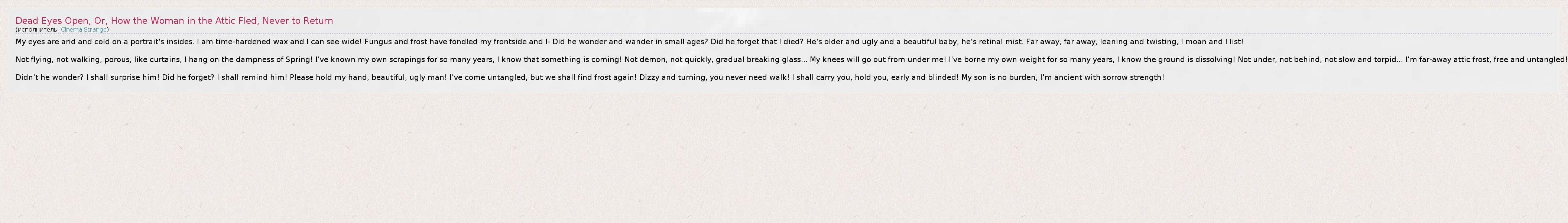 ГлавнаяИсполнителиCinema StrangeDead Eyes Open, Or, How the Woman in the Attic Fled, Never to Return