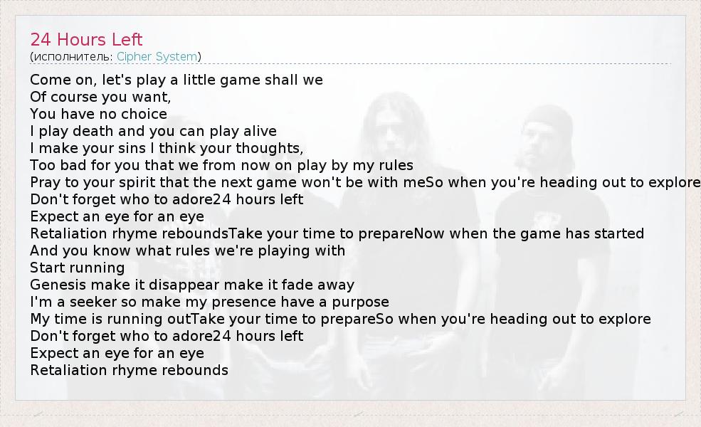 Come on, let's play a little game shall we Of course you want, You have no choice I play death and you can play alive I make your sins I think your thoughts, Too bad for you that we from now on play by my rules Pray to your spirit that the next game won't be with meSo when you're heading out to explore Don't forget who to adore24 hours left Expect an eye for an eye Retaliation rhyme reboundsTake your time to prepareNow when the game has started And you know what rules we're playing with Start running Genesis make it disappear make it fade away I'm a seeker so make my presence have a purpose My time is running outTake your time to prepareSo when you're heading out to explore Don't forget who to adore24 hours left Expect an eye for an eye Retaliation rhyme rebounds